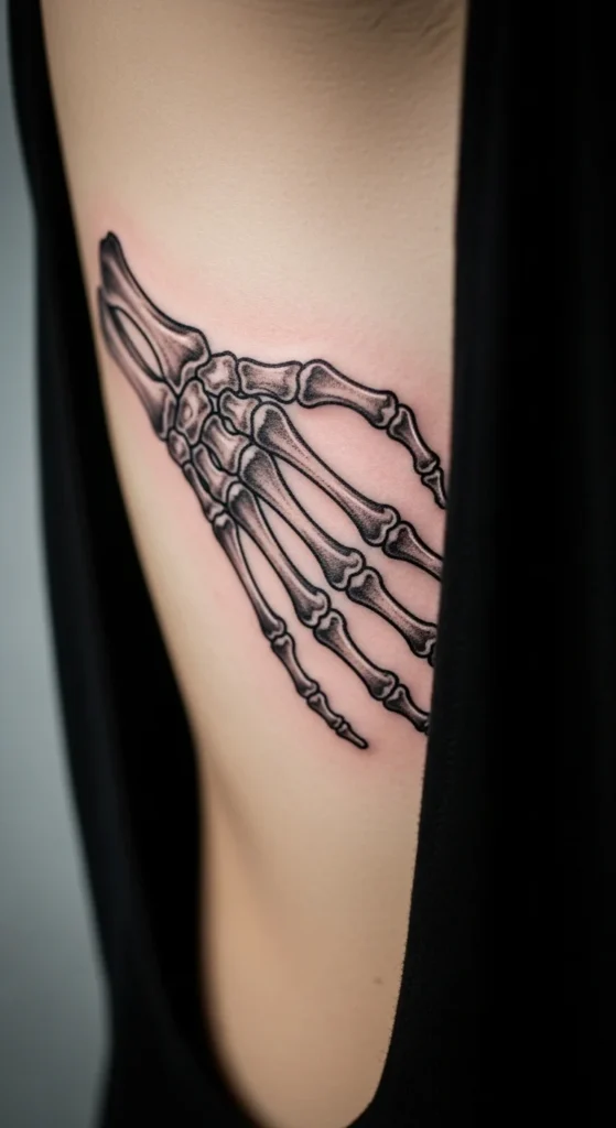 A skeleton hand on the ribs has an edgy, anatomical feel. It can symbolize survival, honesty, or facing life without pretending. The rib area makes it feel hidden and personal, like a private statement.