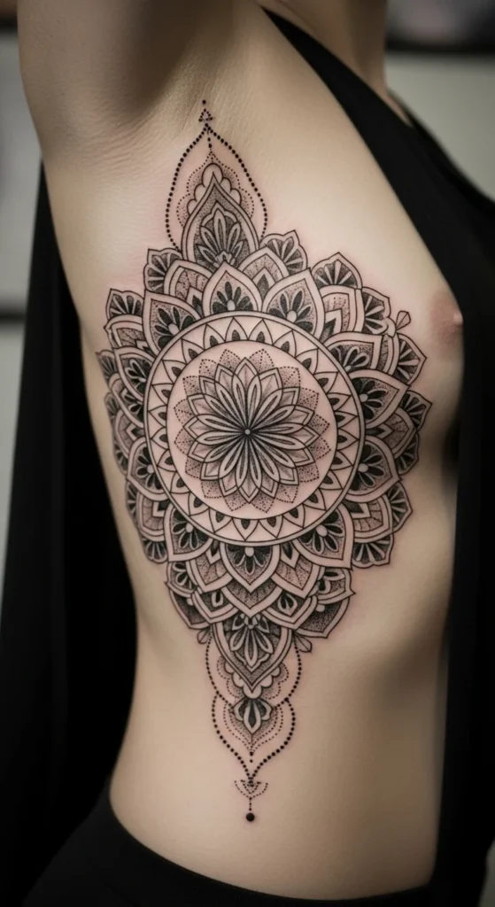 Geometric mandalas feel calm and balanced, and ribs give them a striking shape. You can place a mandala panel on the side ribs or underbust for a “hidden symmetry” look. Dotwork is popular here because it creates texture without heavy fill.