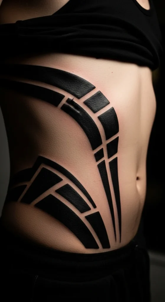 Tribal and bold curved bands work well for ribs because they match the body’s shape and read clearly. This style often appeals to people who want something strong and graphic. Thick lines also tend to age well.