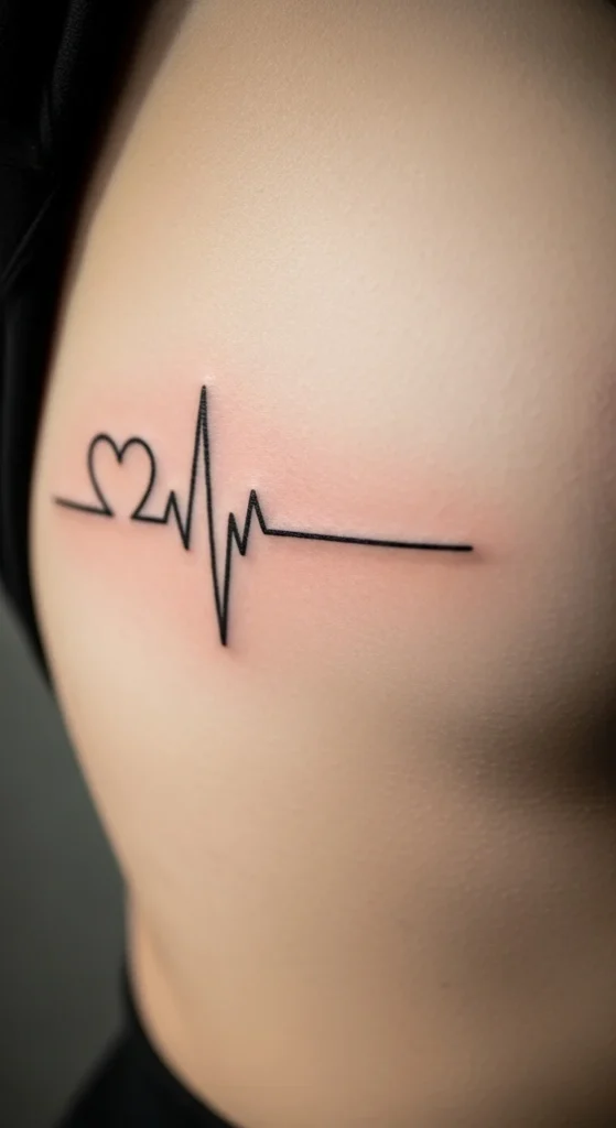 Heartbeat waves are popular because they can represent a person, a pet, or a new chapter of life. On ribs, it feels private and close to the heart. Keep the waveform slightly thicker than “hair thin” so it stays clean as it ages.