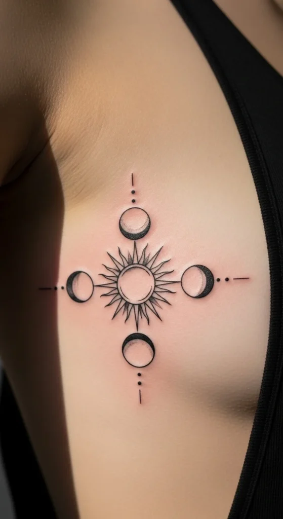 A sun and moon rib tattoo is a simple way to show balance: day and night, calm and energy, softness and strength. You can place the moon higher and the sun lower, or keep them side-by-side along the rib curve.