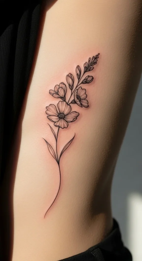 A single wildflower on ribs can feel like a quiet message to yourself. It’s simple, graceful, and easy to place. Choose a flower that matches your meaning—daisy for simplicity, lavender for calm, poppy for remembrance.