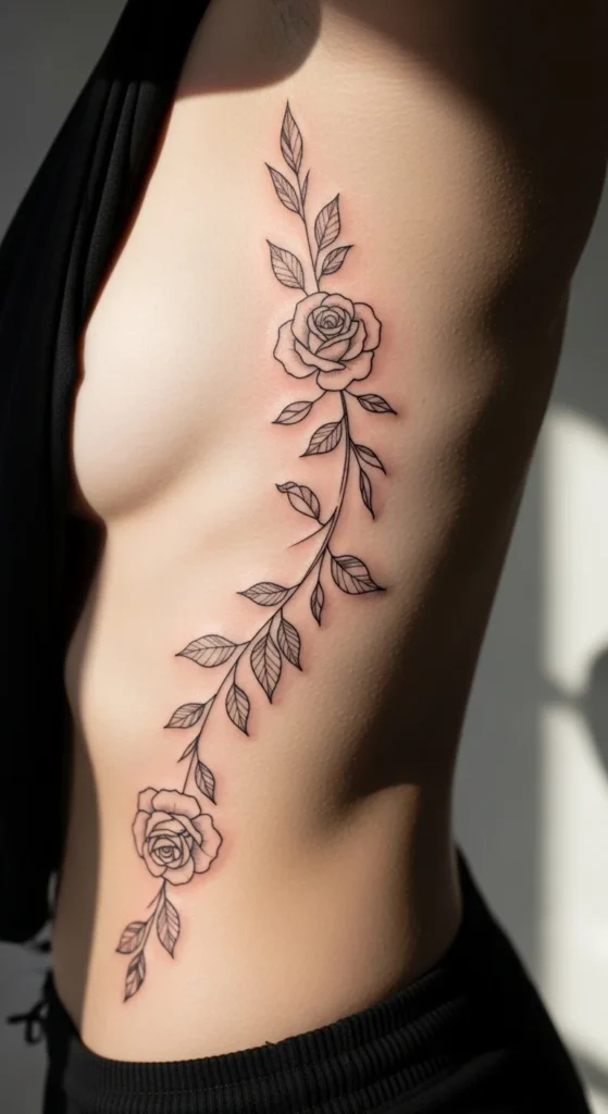 A rose vine on the ribs looks graceful because it naturally “travels” with your body shape. Keep the vine thin and let the leaves do the curving work. That makes it flattering from every angle. If you want a personal touch, use three roses to represent three people or three life chapters.