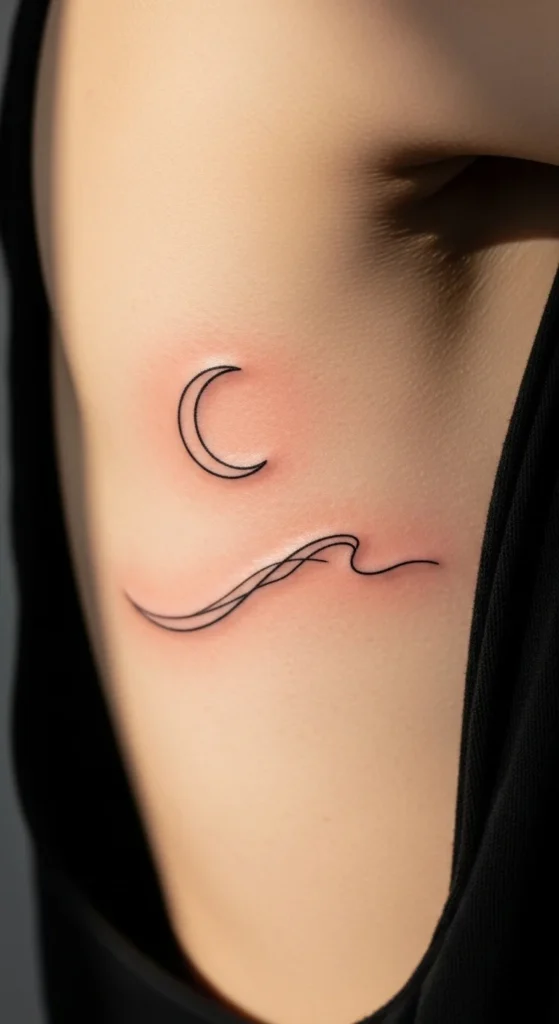 Minimalist celestial tattoos look great on ribs because the placement already feels intimate. A small crescent moon with two stars can carry a lot of meaning without taking much space. Keep the shapes clean and slightly thicker than “super thin,” so they age better.