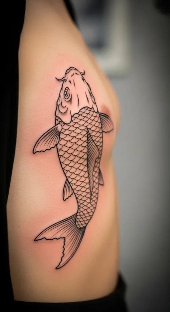 A koi fish on ribs often represents perseverance and staying steady through pressure. It looks best when it “swims” upward along the rib curve. Add subtle water lines if you want movement, but keep them minimal so the design stays clean.
