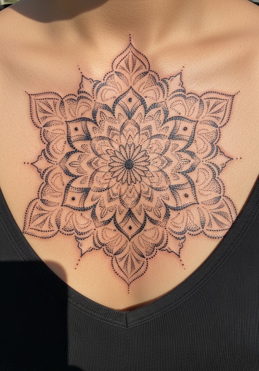 I saw this at a convention and loved the way dots read from a distance. Dotwork takes time and patience. Expect a long session if you want a large mandala spanning the ribs. Tell the artist you prefer density over random sparseness because evenness matters as dots age. The mistake I witness often is starting with too wide negative gaps. From what I've seen, consistent stippling gives a soft fade that looks intentional at two and five years. Pain is steady but manageable with breaks. This suits someone who wants meditative imagery and can sit longer.