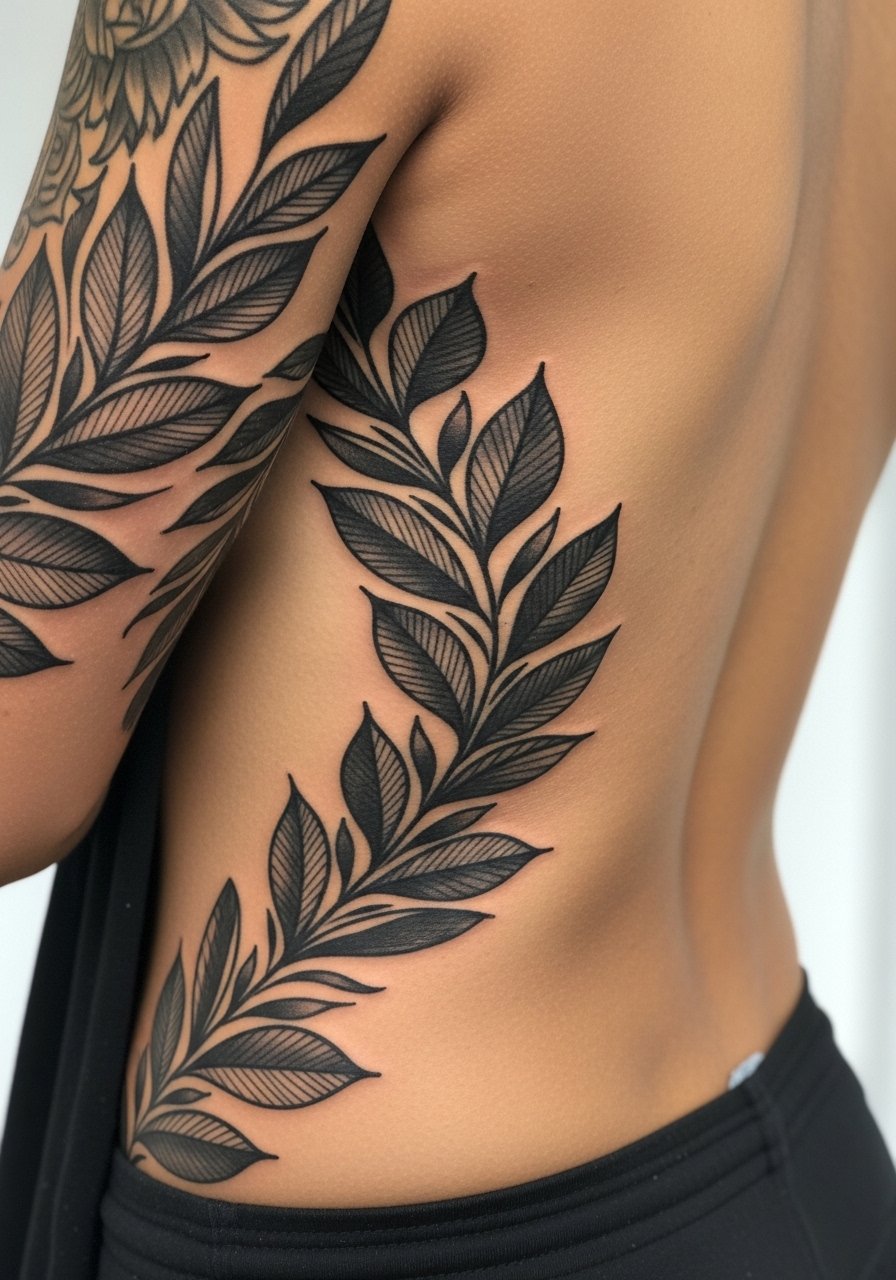 I found a local artist who builds botanical wraps using negative space. Blackwork on the ribs needs strong heals because large fills can scab. Expect multiple sessions. Tell your artist you want blocky fills with breathing room. A mistake I see is overfilling tiny areas leading to blowouts. Proper planning and staged sessions prevent this. After a year, well-done blackwork keeps its silhouette. This is for collectors who want a dramatic look and can commit to multiple sittings.