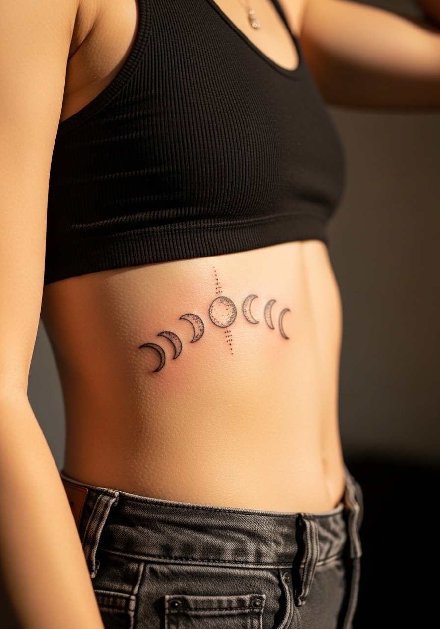 I recommend lunar phases if you like symbolism that follows your rib curve. It hurts but each moon can be done as a short pass. Tell your artist you want consistent spacing and slightly bolder crescent edges. The common mistake is making moons too small. Tiny moons merge into a gray smudge over time. At six months phases read clearly. At two years small moons may need thicker ink to remain distinct. This is a good option for first-timers who can handle brief spikes of pain.