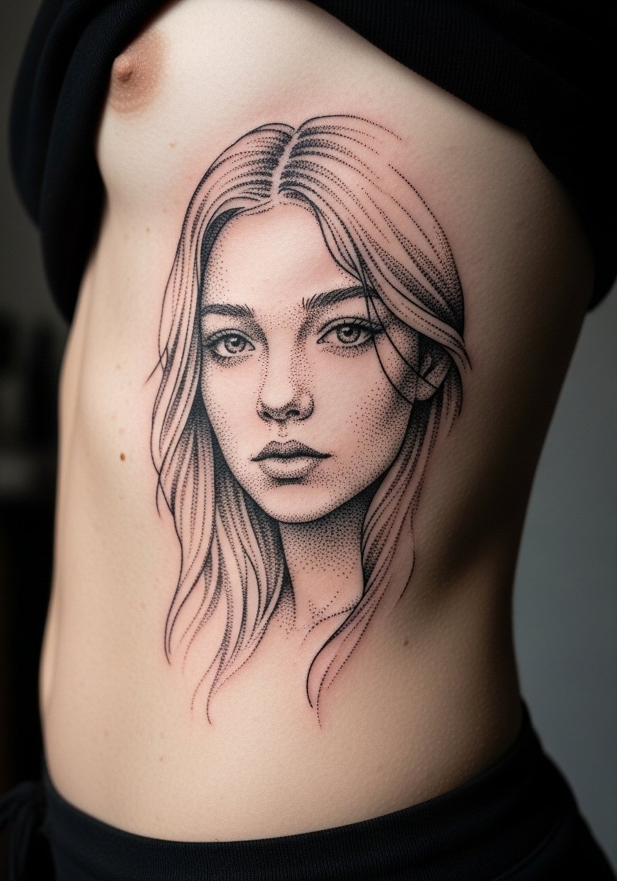 I like portraits that rely on negative space rather than heavy lines. Pain is steady, and the work requires patience. Sessions are long for high-detail stippling. Tell the artist you want reference contrast adjusted for skin tone and rib contour. People often underestimate how much negative space they need. Too little space makes details blend after healing. From what I've seen, this approach ages gently with a soft, photograph-like quality at one year. This is for someone who wants realism without heavy black outlines.