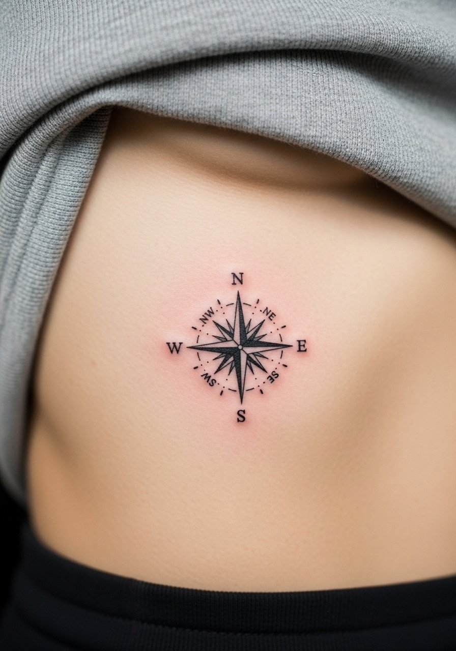 I chose a compass for a subtle directional piece. The lower rib area stings more because the skin is thin. Tiny pieces like compasses can be done quickly. The biggest mistake is asking for ultra-fine points. Fine points flatten with movement. Tell your artist you want slightly reinforced cardinal ticks to preserve clarity at one year. Healing shows crisp edges at six months if aftercare is followed. This is ideal if you want symbolism in a small, revealable spot.