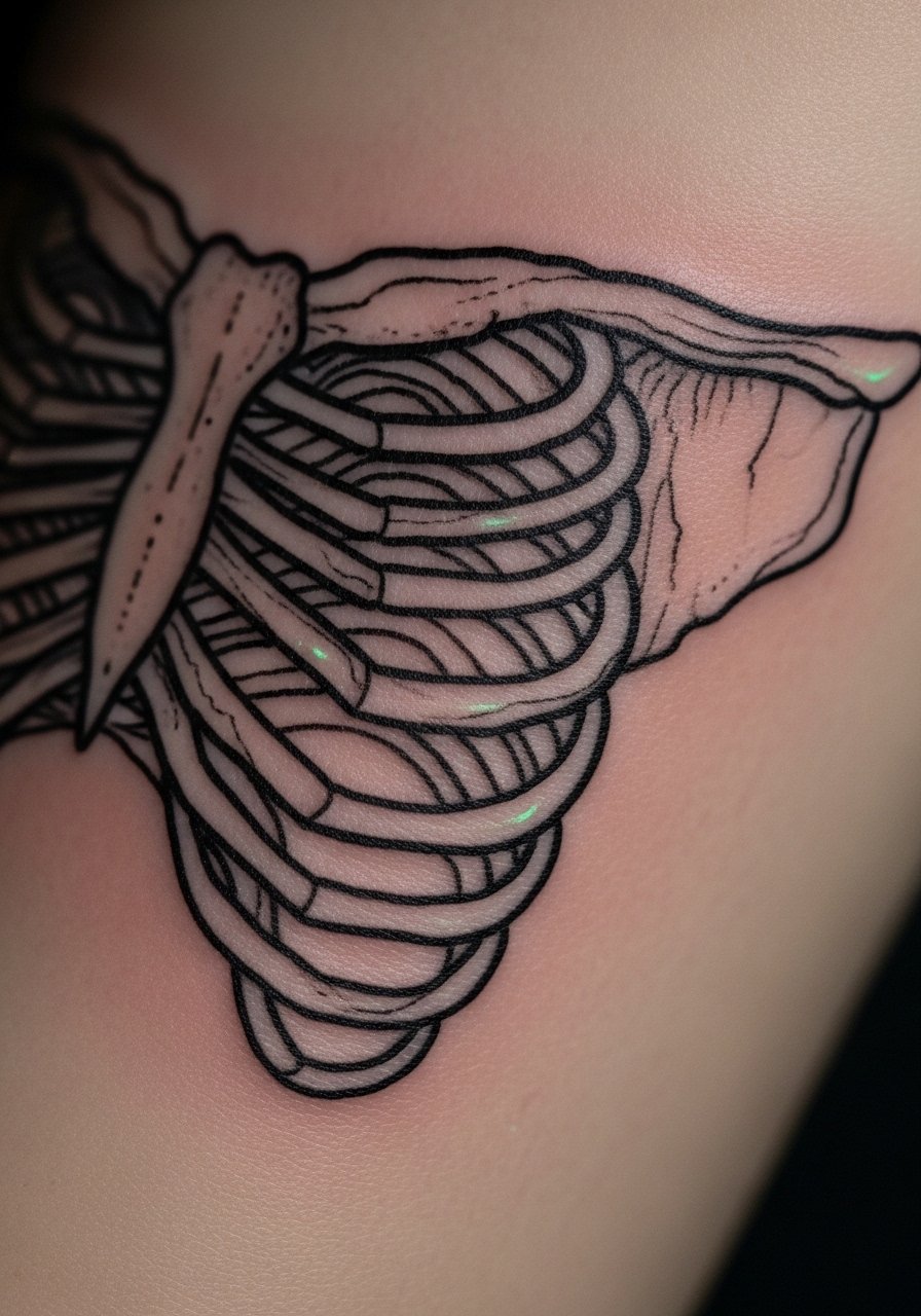 I experimented with subtle UV touches added to a standard black outline. The ribs are great for secret accents that pop under club lighting. UV spots do fade faster so expect maintenance. Pain is similar to regular ink. Tell your artist you want minimal UV and strong black anchors so design still reads in daylight. The mistake I often see is relying solely on UV for visibility. At six months UV is faint in daylight. At two years it may be gone unless refreshed. This is for people who want a playful, low-key glow.