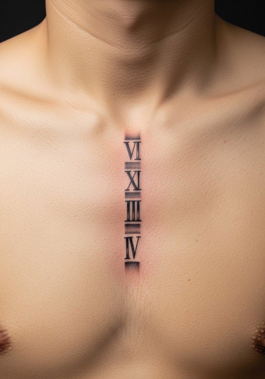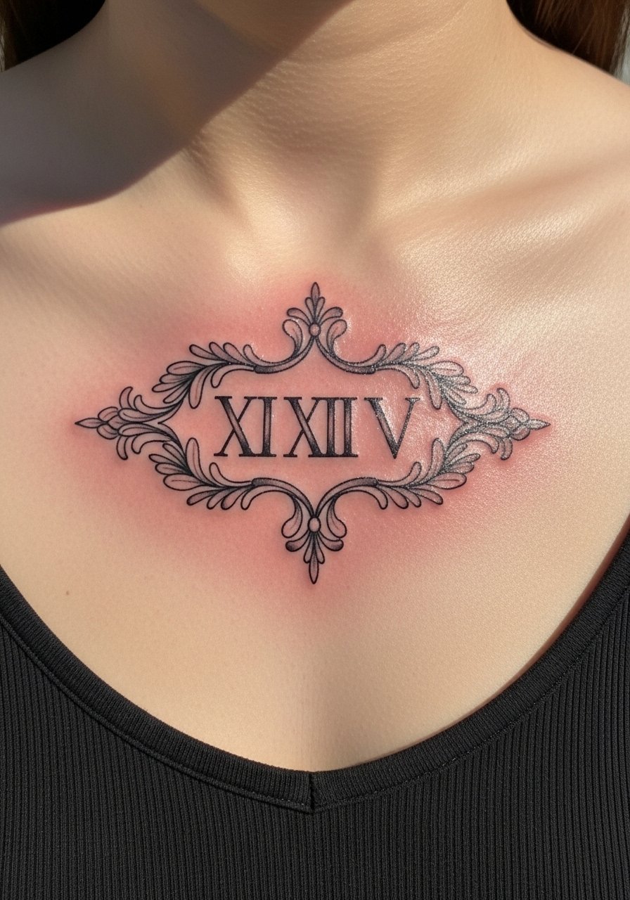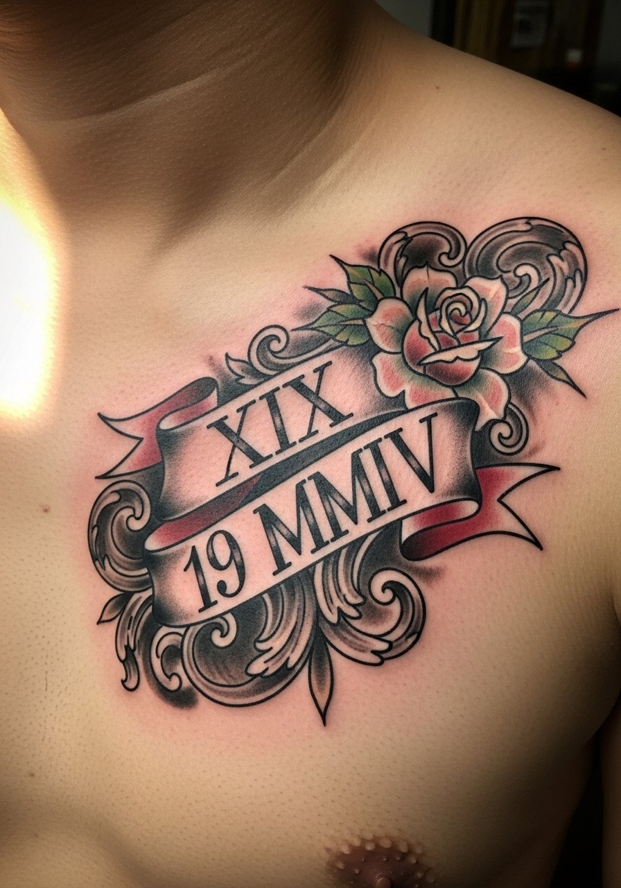 I liked the contrast of numerals and botanicals. Flowers can distract from numerals if too busy — balance is key. Sternum sensitivity and movement demand steady aftercare. Ask your artist how the piece looks healed on similar skin tones.