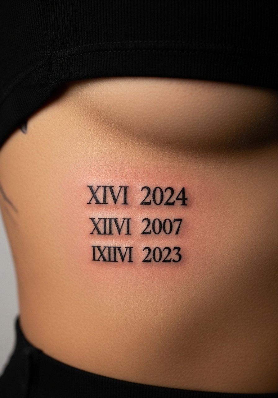 Stacked Roman Numeral Dates on Ribcage (Traditional Script)