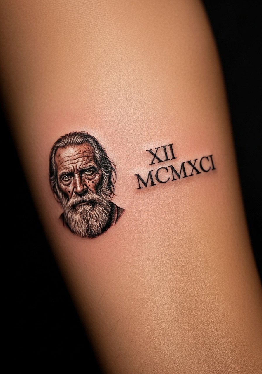 Micro-Realism Roman Numeral With Tiny Portrait on Forearm