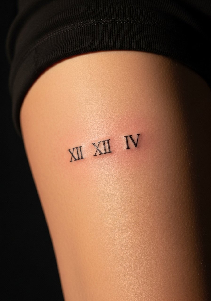 I liked thigh space for a sizable, readable numeral. Thighs heal fast and are low pain. Large numerals maintain clarity; avoid tiny filigree that ages poorly there.