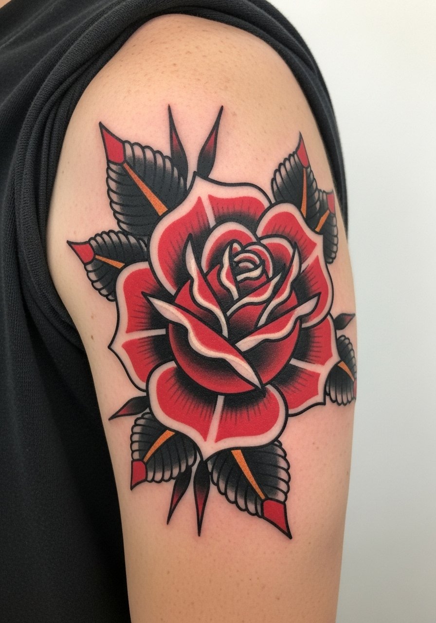 Bold traditional roses read from across the room. I spotted this style on a biker jacket sleeve and loved the high-contrast look. Pain on the upper arm is mild. Sessions usually wrap in one to two hours. Traditional ink holds color well, but watch sun. From what I’ve gathered, heavy black outlines keep the roses legible even as color softens over years. Artists I know recommend solid fill instead of tiny shading when you want longevity. A frequent error is asking for tiny petals inside the outline. They often merge. Ask for saturated color with clean outlines during the consult so your artist plans for touch-up timelines.