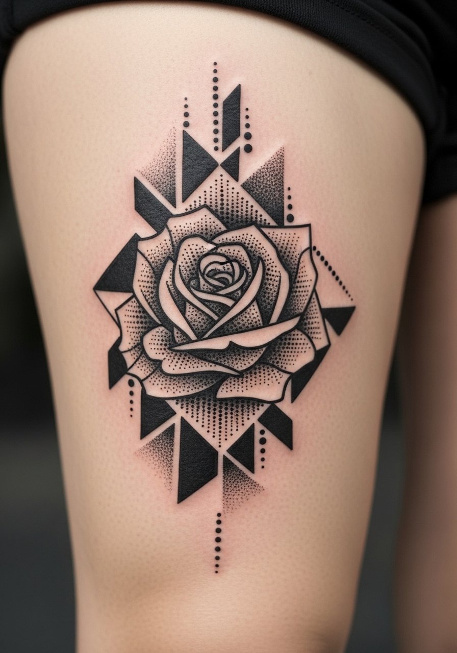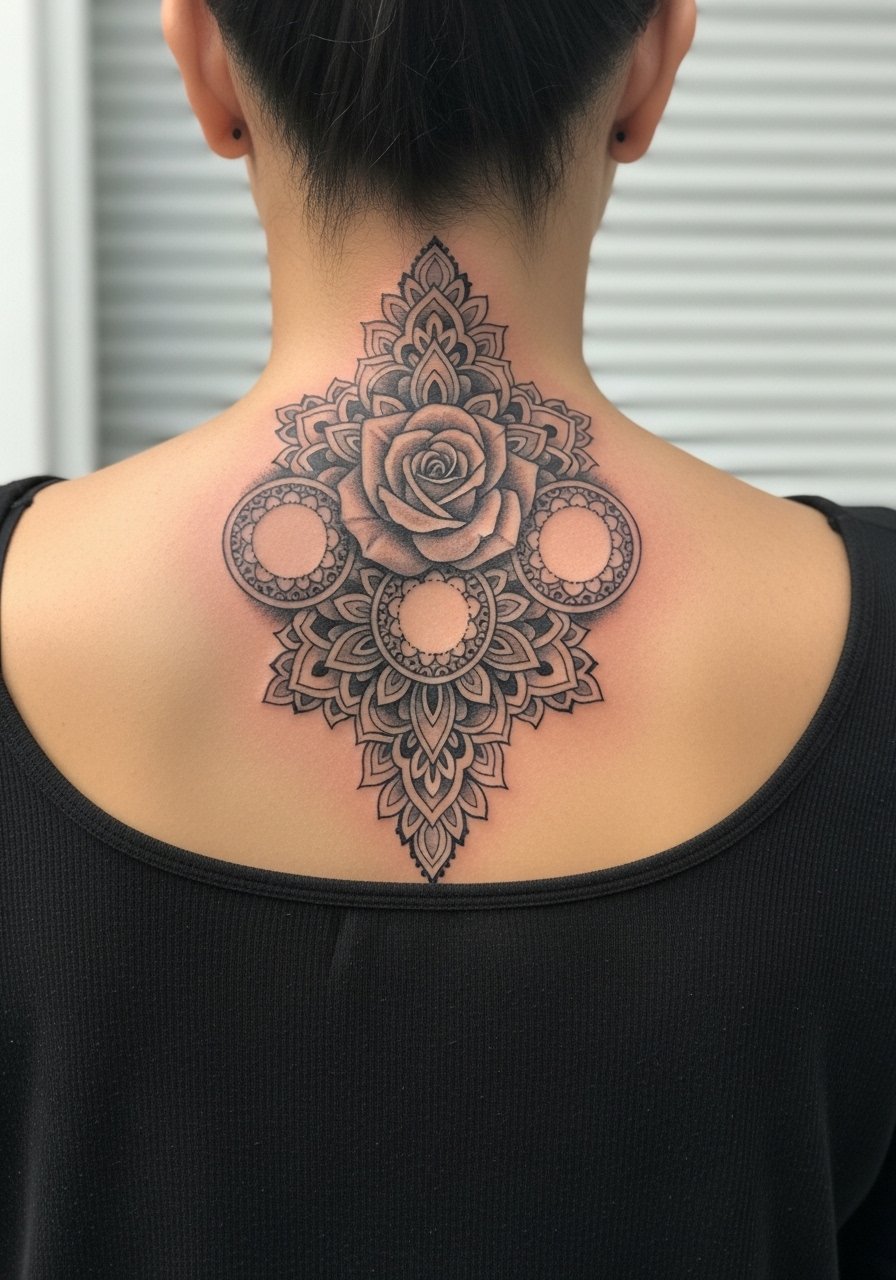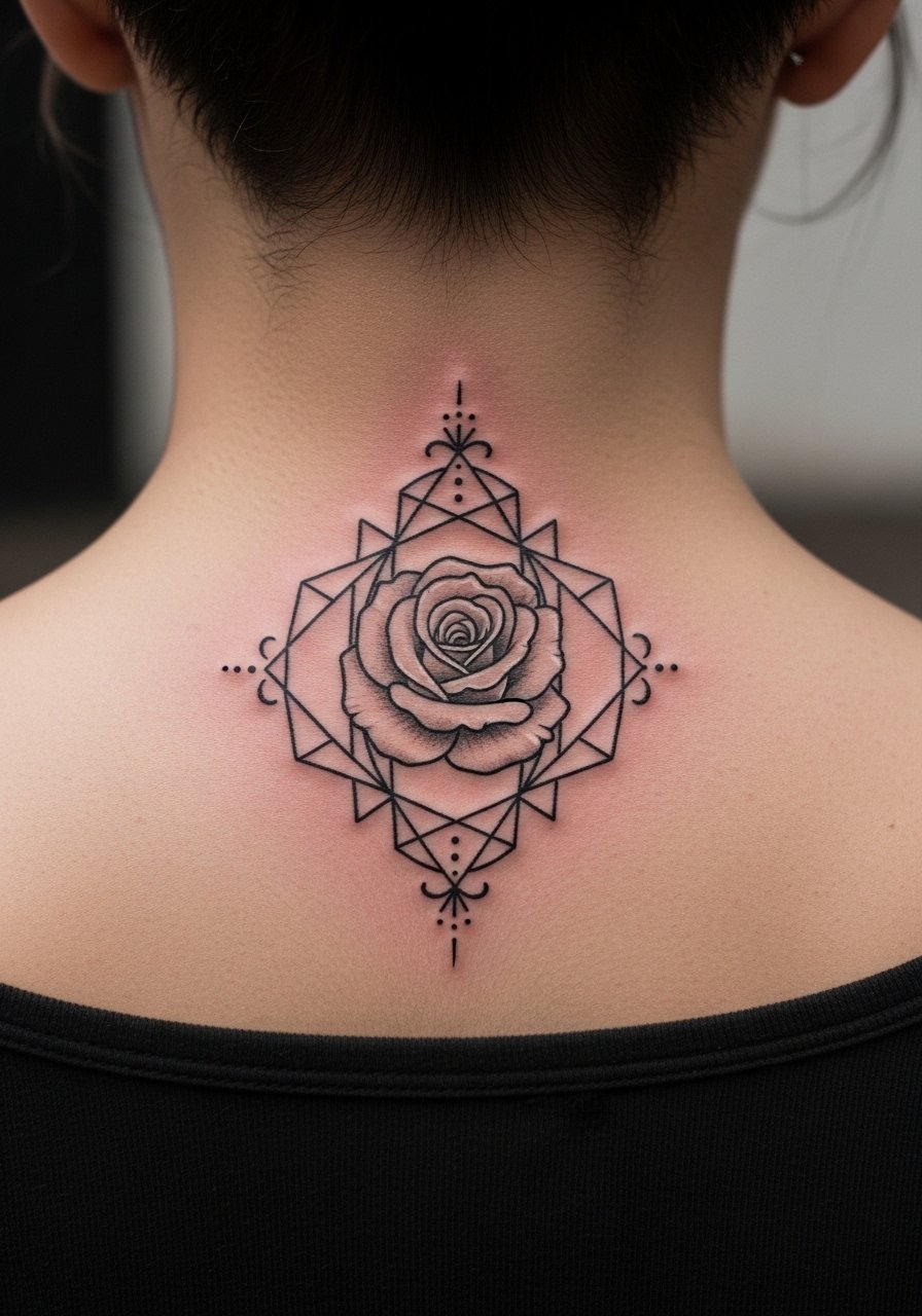 Neck placement is bold and slightly more painful. I saw a version that used too many fine lines and lost clarity. The right move pairs a central rose with thicker geometric lines. Sessions can be one to two hours. For longevity, solid geometry around the flower helps the piece keep shape as the rose ages. A mistake is asking for everything tiny. In consult, request scale tests so the halo reads from a normal social distance. Avoid overly delicate filigree that will blur.
