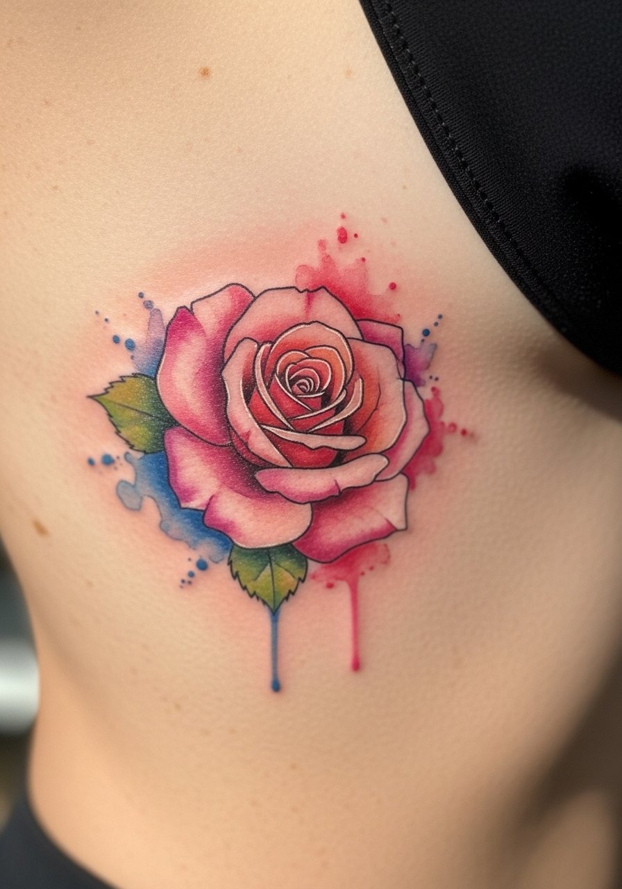 5. Watercolor Rose With Subtle Outline On Ribcage