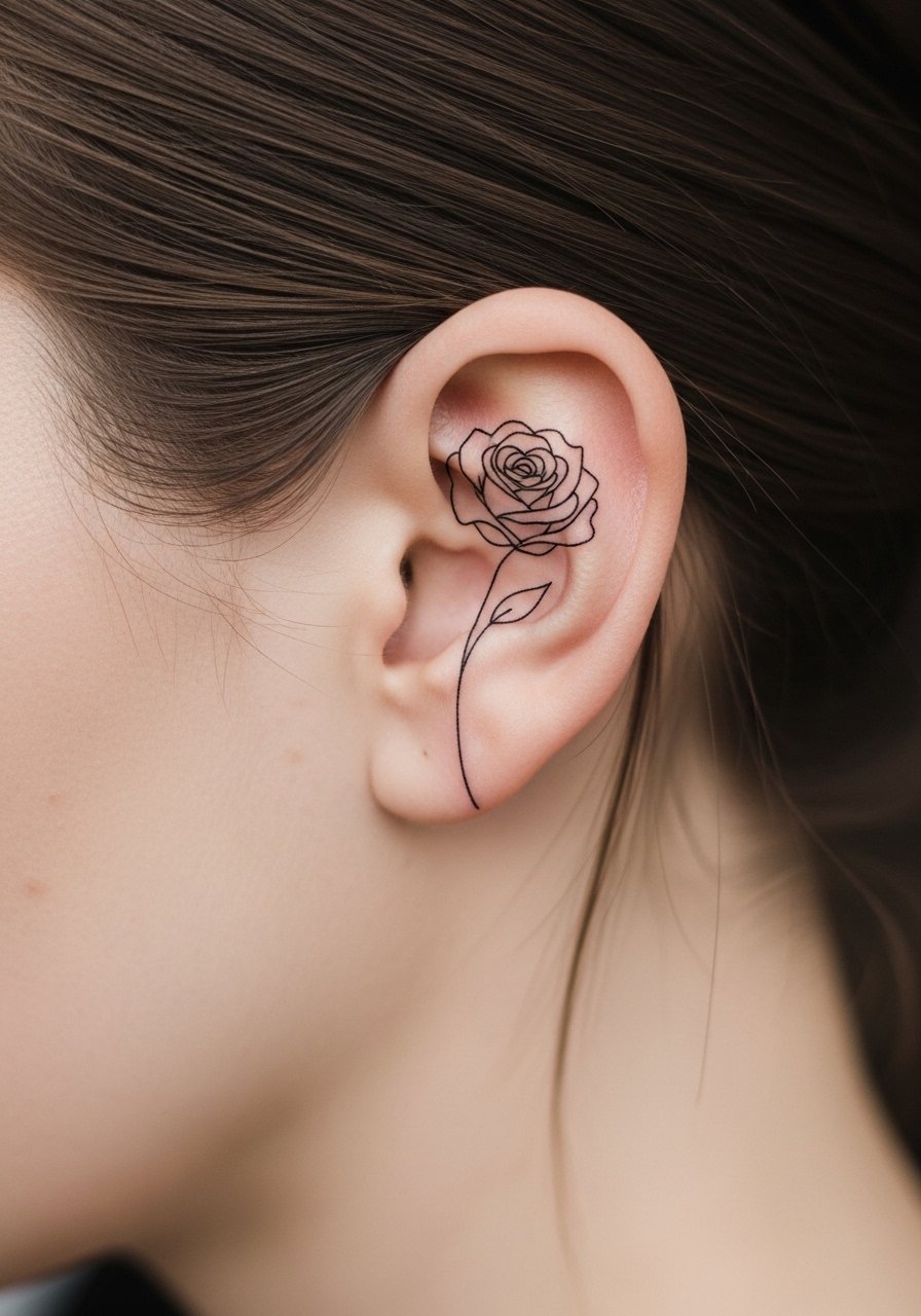 I love tiny behind-ear roses for low-key style. Pain is quick but sharp. Most artists finish these in under 30 minutes. The trick is keeping the line bold enough so it does not vanish. From what I've noticed, ultra-thin continuous single-line tattoos can blur into an indecipherable line after two years. Avoid designs with tiny loops or micro-dots behind the ear. Tell your artist you want slightly bolder single-line weight and ask to see healed photos of similar placements. Clean aftercare matters here because the area is prone to rubbing with hair.