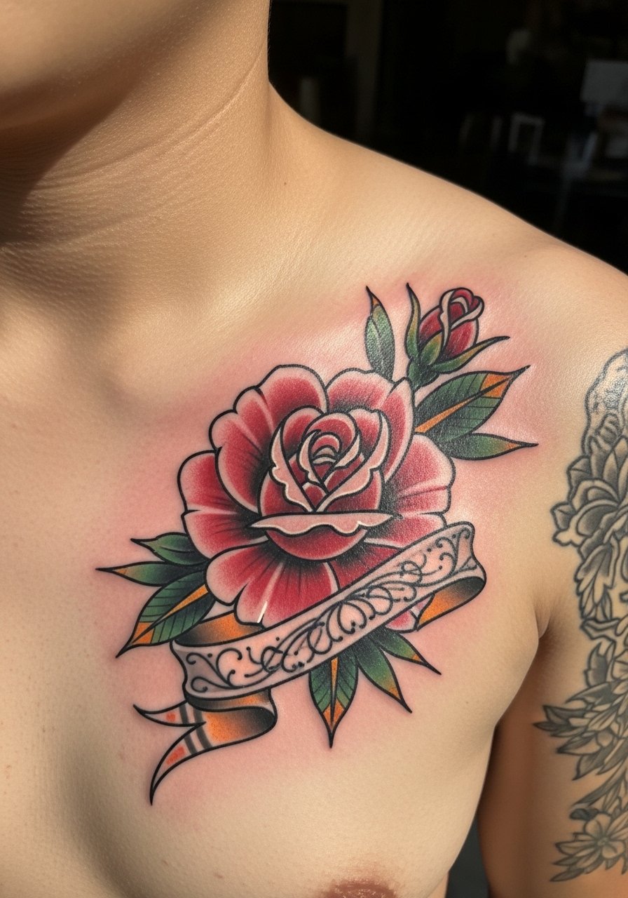 7. Neo-Traditional Rose With Banner On Upper Chest
