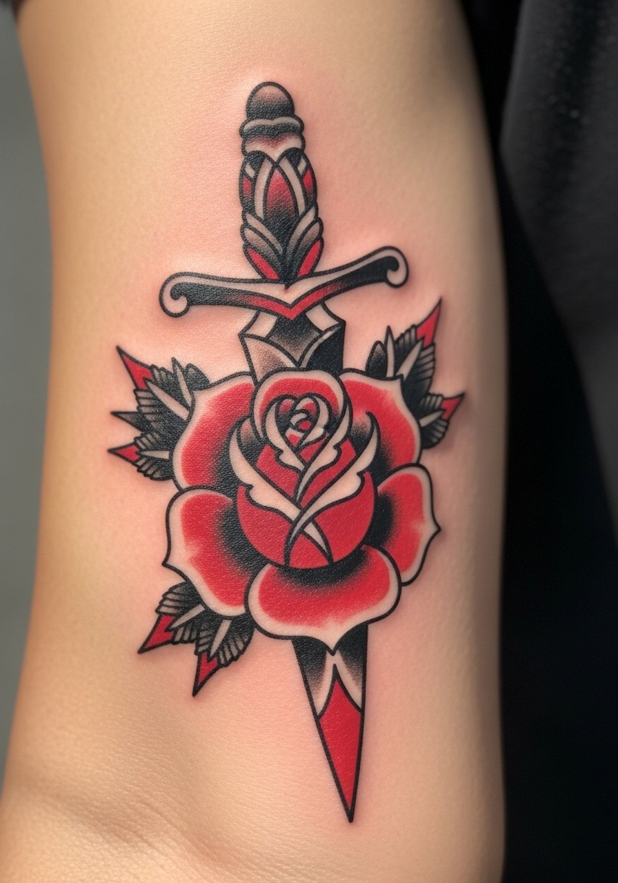 I saw this combo on a tattoo shop wall and loved its narrative feel. Forearm placement reads well and is low pain. Session time varies from one to three hours. The bold outlines make it resilient. A mistake I often see is shrinking the dagger details too small when the client wants a big visual. Tell your artist how large you want it to read from arm's length. If you care about longevity, insist on solid black outlines and full fill to prevent early blurring. At two years it still looks strong provided you avoid heavy sun exposure.