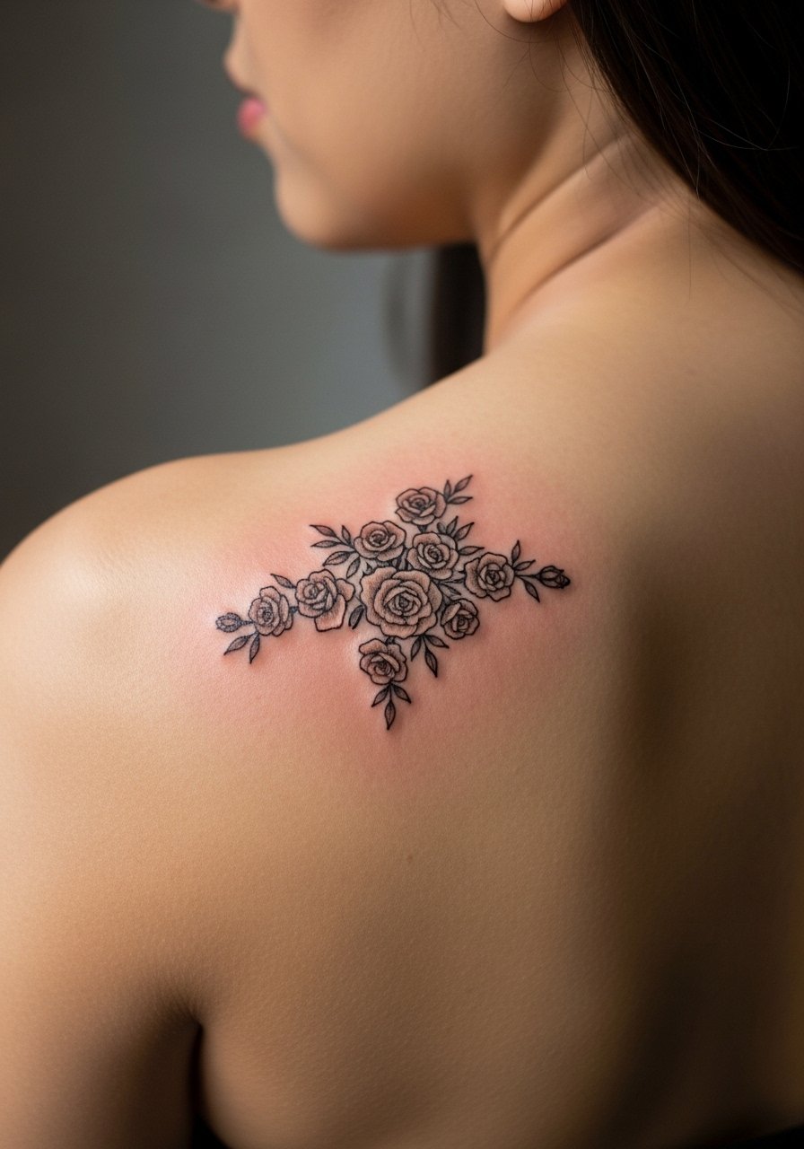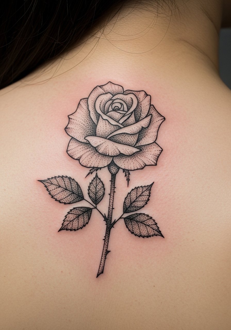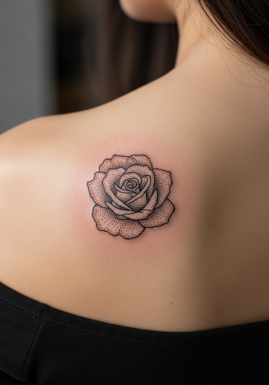 I like sparse dot roses because they read as whisper tattoos. Behind the shoulder is a low-interaction area so healing is smooth. Pain is mild. Sessions are short. The common issue is making dots too close. They can merge with motion and time. Tell your artist you want airy spacing and ask for a mock healed template. At six months the dot gradients look soft. Over years, the pattern keeps its airy feel if spacing was respected.