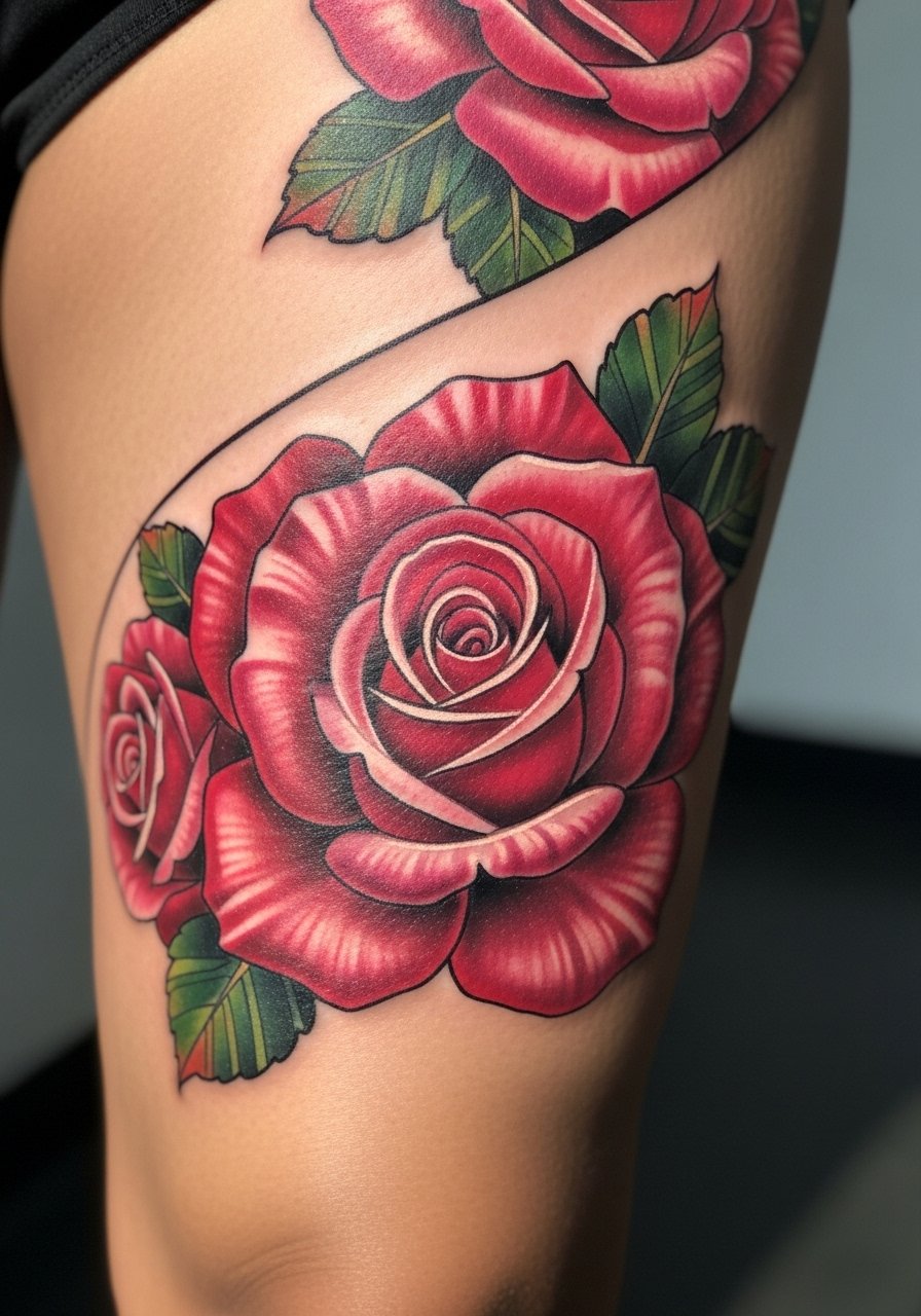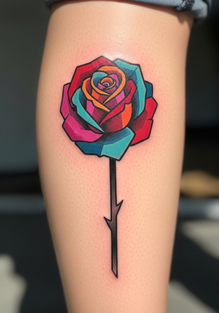 Color block is modern and graphic. I saw a calf sleeve that used flat panels to let the rose pop. Calf is forgiving. Pain is low. Sessions span multiple sittings. This style ages well because large flat color stays visible longer than tiny gradients. A mistake people make is mixing too many thin color transitions. Ask your artist for bold blocks and for pigment choices that hold in your skin tone. Healed results remain vibrant with periodic maintenance.