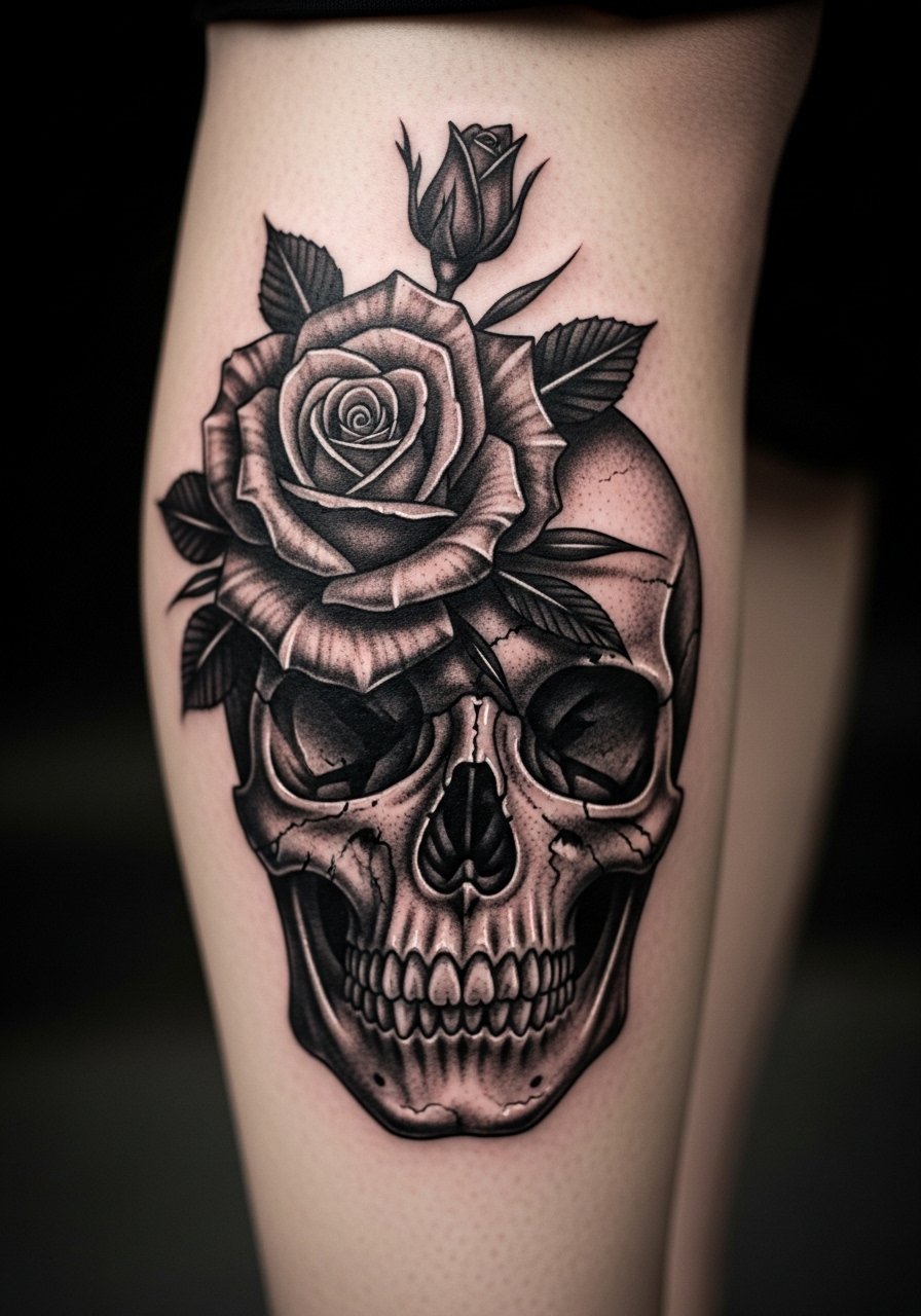 I noticed this motif on collectors who like moody imagery. The calf is forgiving for dark work. Pain is low. Sessions are often two to four hours. Micro-realism here needs careful planning so the skull and rose don't compete for attention. A bad move is compressing both elements into a tiny space. Ask your artist how they will manage negative space and which element will take visual priority. Healed results at six months show defined shadow. Expect contrast to mellow slightly over time.