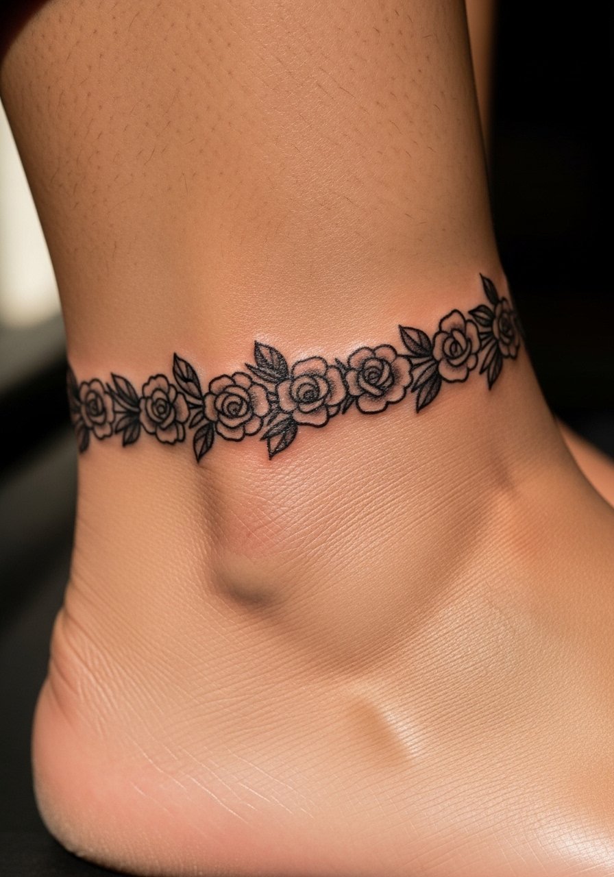 Rings around the ankle are pretty but need placement planning. I recommend spacing the roses so they sit between ankle bones and avoid high-friction zones. Pain is moderate. Sessions are one to two hours. A common error is creating a continuous heavy band that rubs under socks. Request a gap or slightly raised placement where shoes won't press. At six months the wreath looks delicate. Expect the lower side to need touch-up first because of friction.