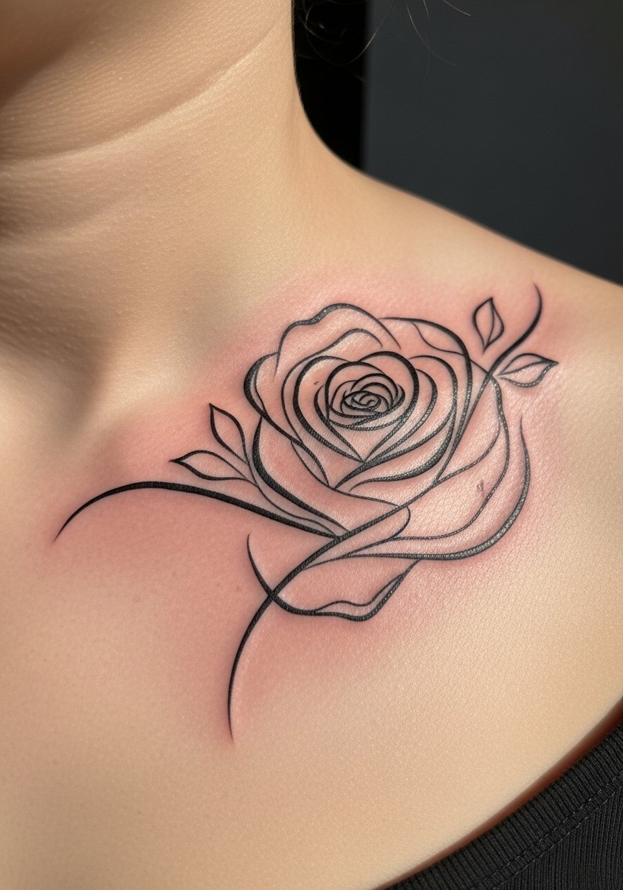 I discovered abstract line roses on gallery-style portfolios. Collarbone placement shows off the shapes. Pain is moderate near bone. Sessions are usually under two hours. The abstract approach ages well if lines are intentional and not overly faint. A common mistake is asking for nearly invisible strokes that vanish. During consult, show artists your desired visibility in healed photos. Ask for a graphical plan so the line work maintains its flow as the skin settles.