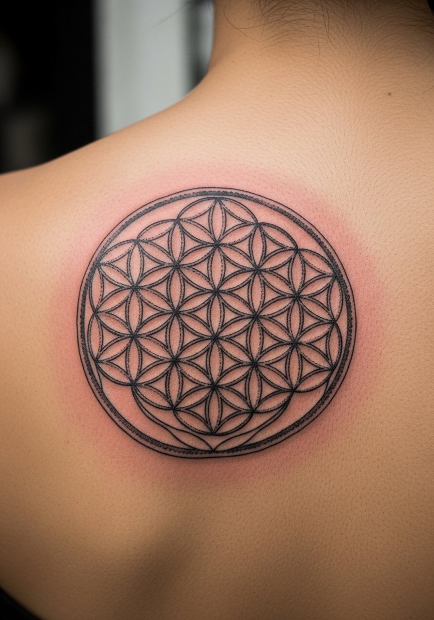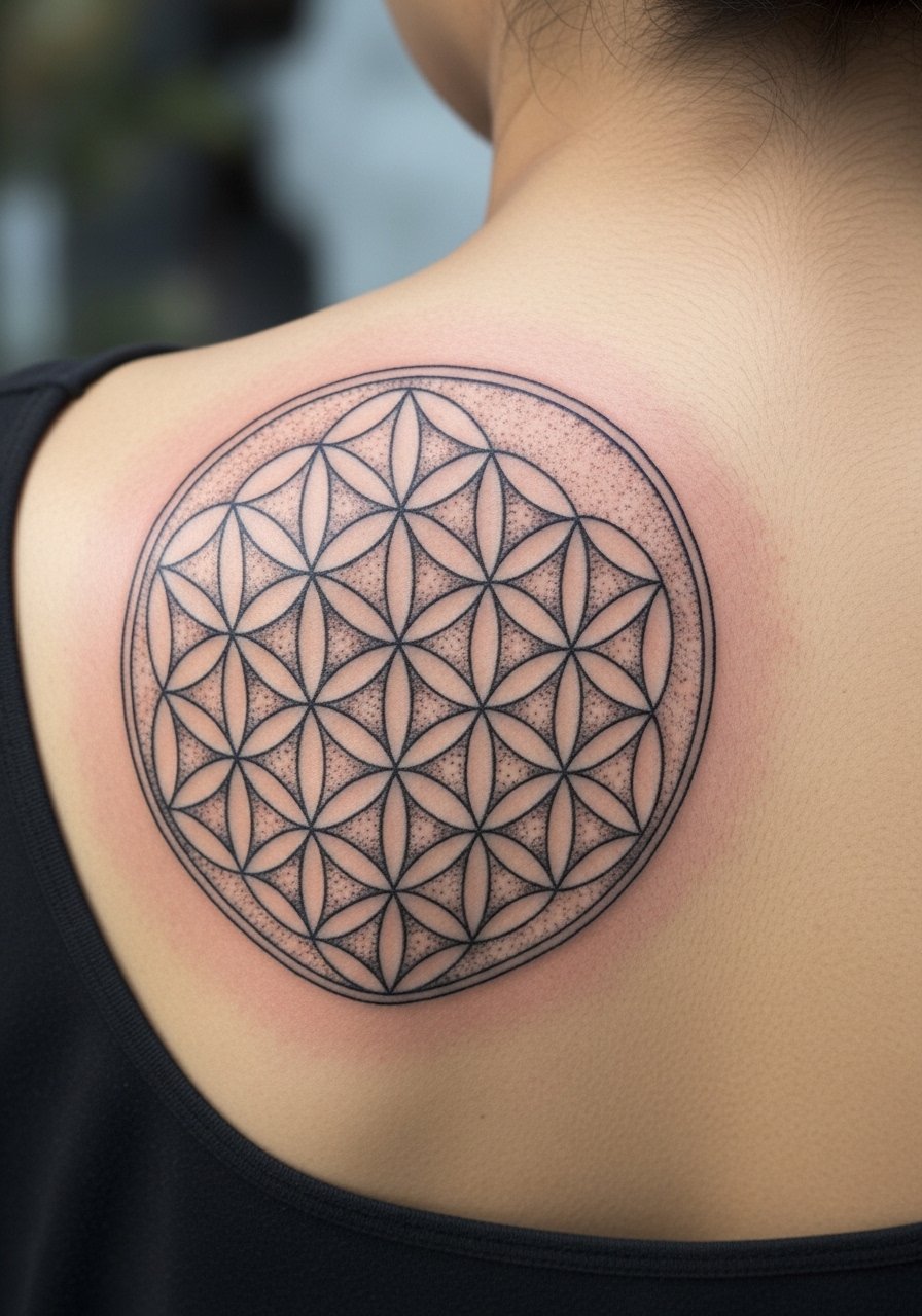The Flower of Life reads as both delicate and architectural. On the upper back it uses natural symmetry, which helps the circles sit perfectly. Expect medium discomfort and multi-session work. Dotwork keeps the texture alive while black ink preserves contrast long-term. Common mistake: asking for too-small detail — these need space. Ask for an artist experienced in mandalas who understands body mapping and symmetry.
