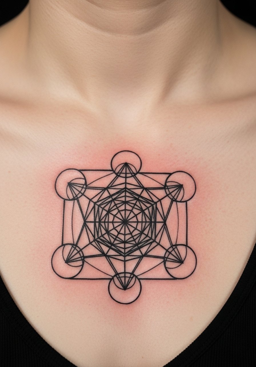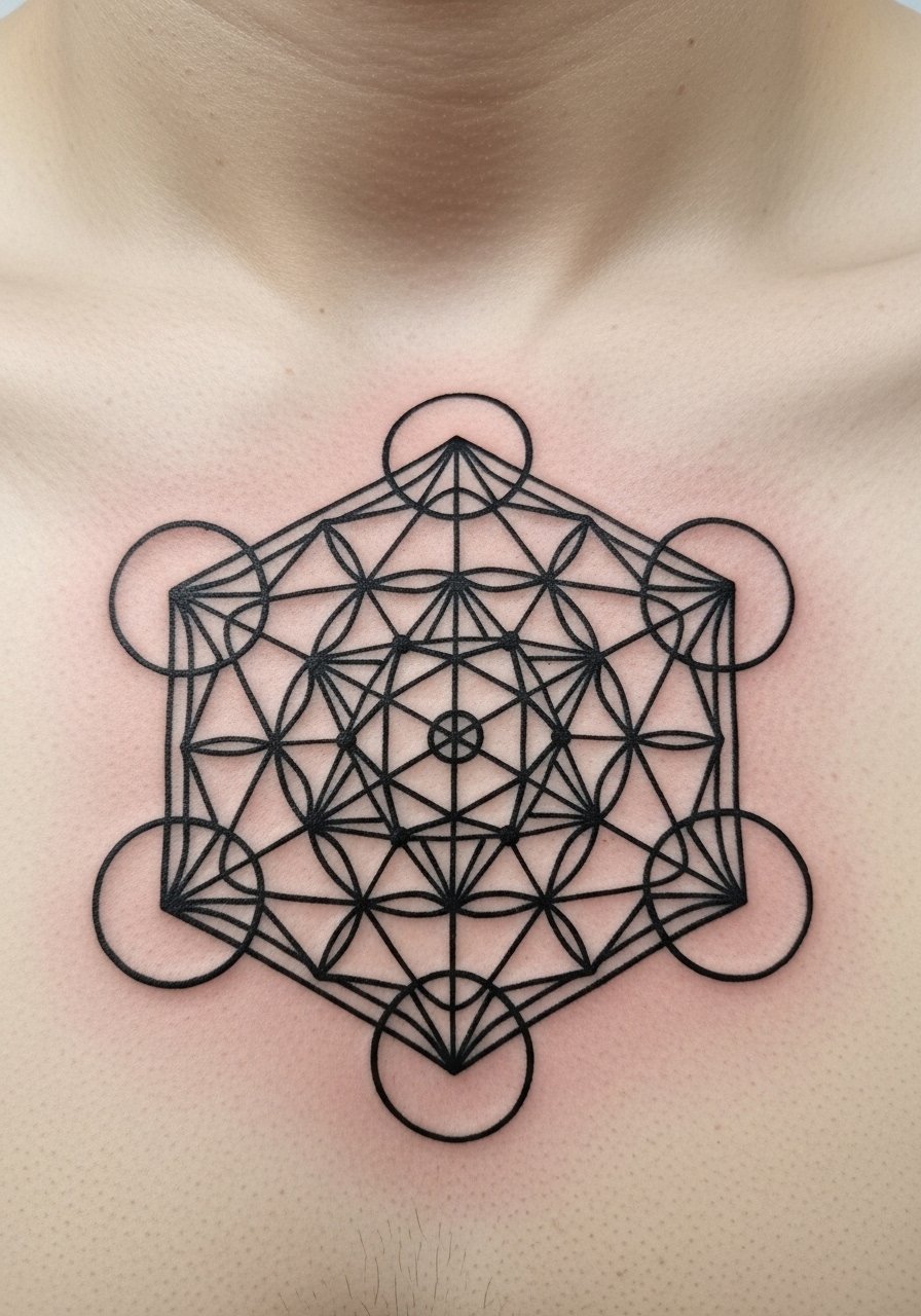 Metatron’s Cube is all about interconnected balance. The chest gives enough flat surface for precise linework and a centered composition. Lines must be perfectly straight — go to an artist who specializes in architectural geometry. Expect a few sessions and a careful aftercare plan; fine lines can blur if rushed. Avoid overly thin single-needle execution unless the artist has proven healed examples.