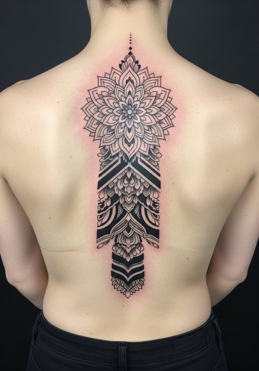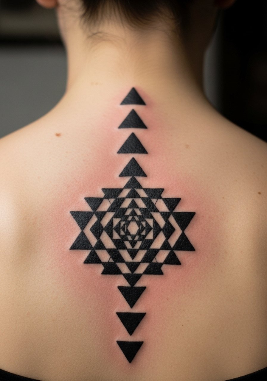 The Sri Yantra needs precision and symmetry to function as a meditative anchor. The spine’s vertical axis helps center the bindu point. This placement is painful and needs an artist who maps proportions precisely. Healing requires patience; stretching and movement can affect lines. Avoid off-center stencils — always proof the alignment before ink.