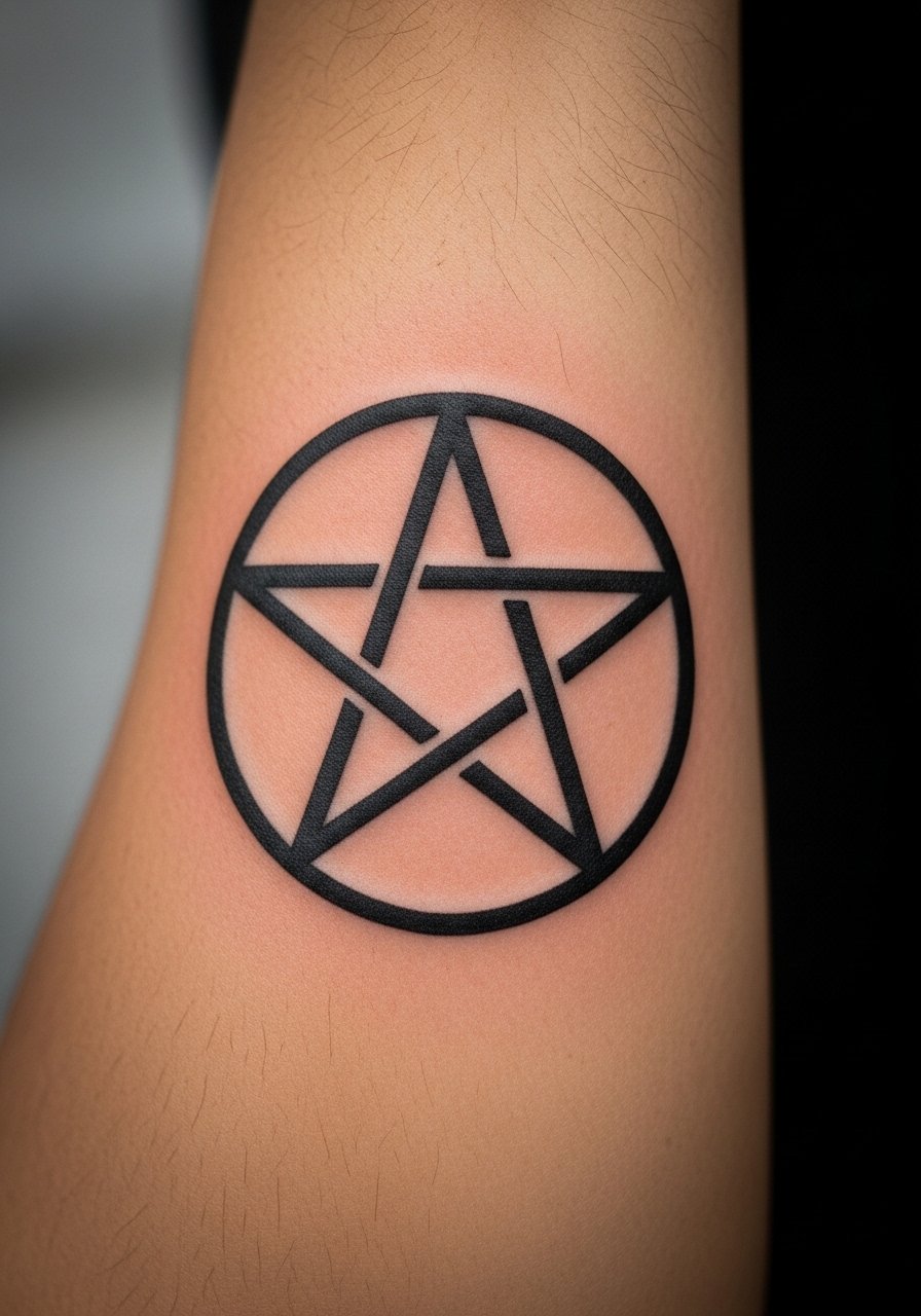 A pentagram inside a circle reads clearly and ages reliably with bold blackwork. The outer forearm provides a flat canvas for strong lines that resist blur. This style is forgiving; thick outlines protect inner details. A common mistake is cramped points — keep shapes proportional. If symbolism matters, discuss variations with your artist.