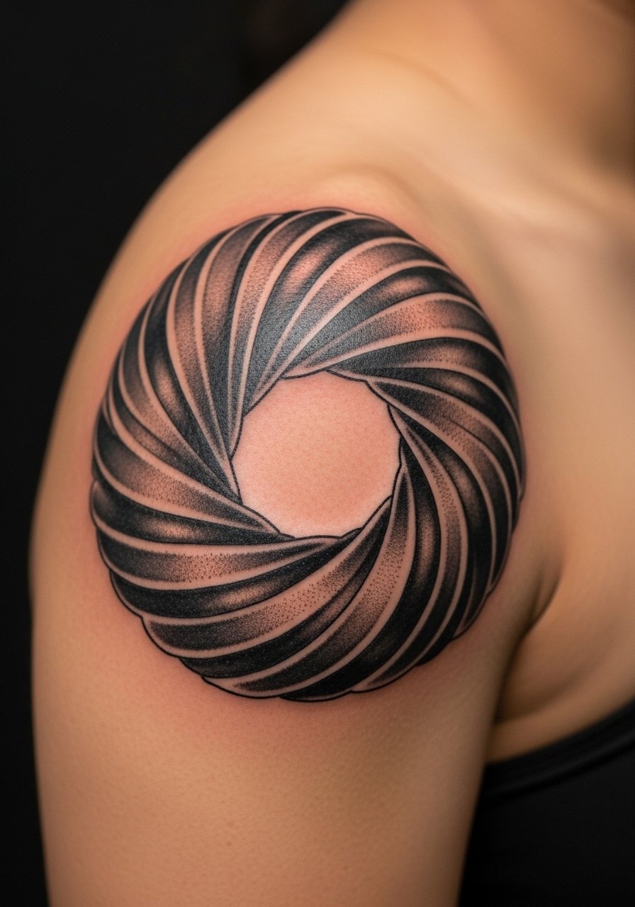 A torus vortex plays with 3D illusion and looks great on rounded shoulder anatomy. The curve helps the vortex read as motion. Artists who understand flow and shading will give the design life. Keep contrast high; subtle grays can get lost over time. A common mistake is ignoring body contours — the pattern must wrap the shoulder without distortion.