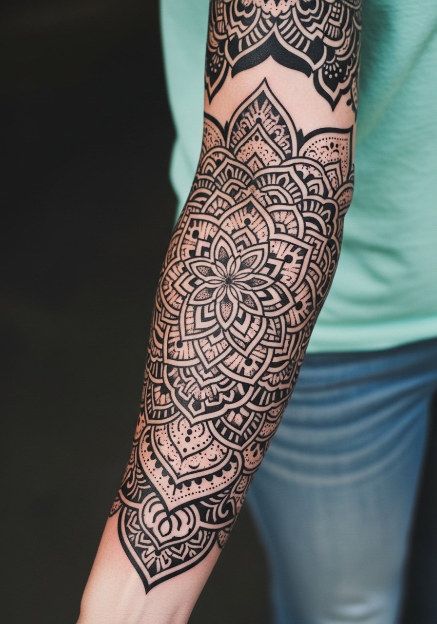 Sleeve mandalas combine symmetry and body flow. They’re designed to move with muscles and curves, so consult an artist experienced in arm wraps. Plan multiple sessions; expect moderate pain in inner arm areas. Blackwork and dotwork together provide long-term clarity. Avoid overfilling with tiny details that blur; let negative space breathe.