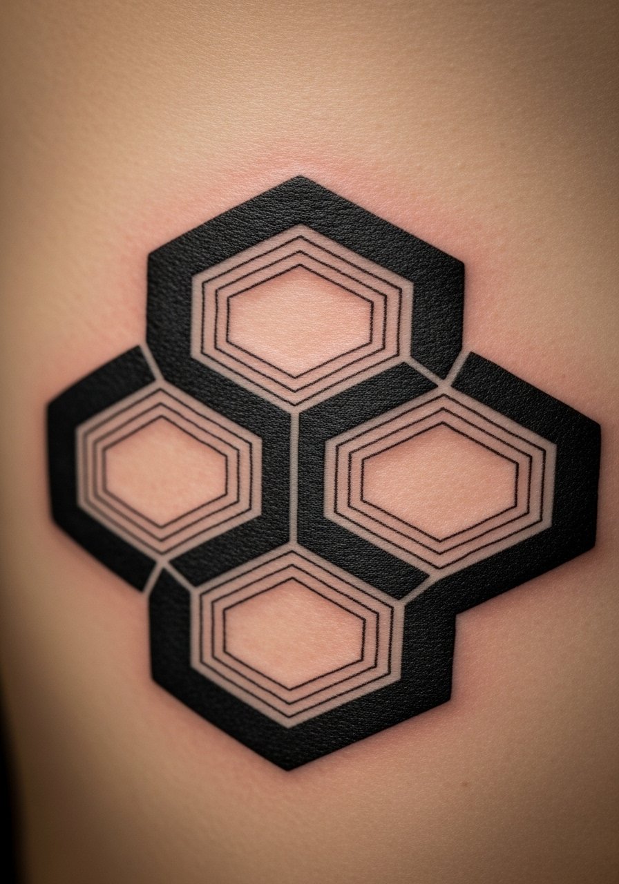 Ribcage hex patterns are striking and intimate. The curve of the ribs can make modular patterns look dynamic. This is a painful area but worth it for a private piece. Blackwork keeps hex lines readable as skin shifts. Avoid overcrowding; leave negative space to maintain balance and reduce future blurring.