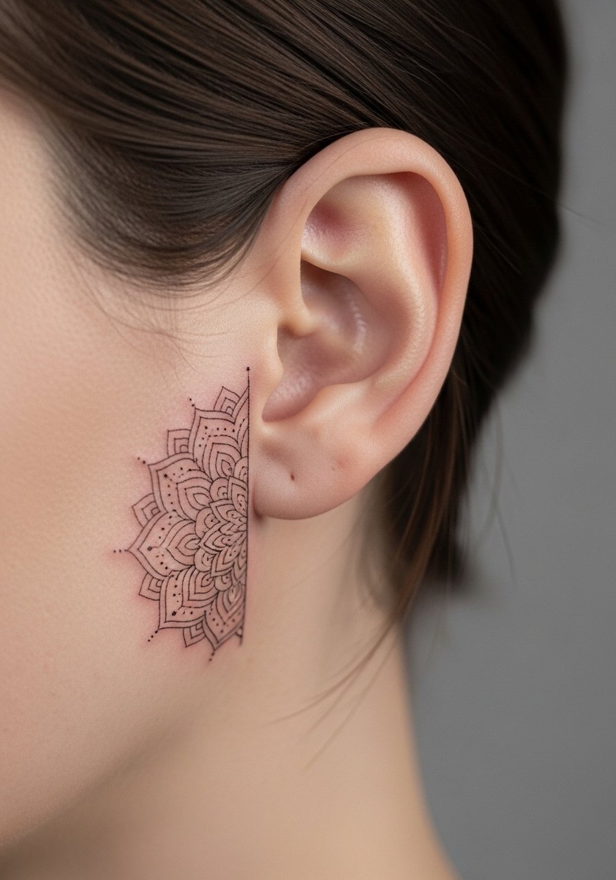 A half mandala behind the ear gives a hint of symmetry without taking up a lot of space. It’s subtle and ages okay if lines aren’t ultra-thin. Pain is moderate and healing needs careful sleeping position attention. The main mistake is cramming too many petals; keep design airy so it reads healed.