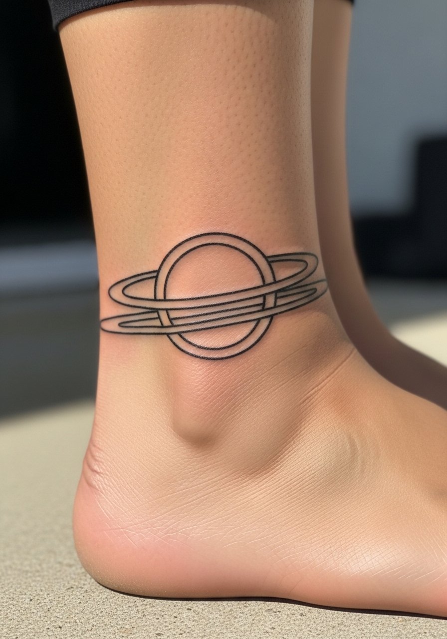 An ankle orbital band is a discreet way to wear sacred geometry daily. The band wraps and follows the ankle’s curve; spacing must be consistent. Pain is moderate and healing benefits from low-friction clothing. A frequent error is making lines unequal around the curve — insist on a test wrap and transfer before inking.