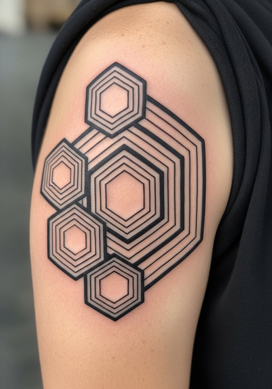 Concentric hexagons create a stable, honeycomb-like feel. Upper arm placement is forgiving and low-pain. This design is durable — bold outlines keep the geometry readable as it ages. Avoid too many micro-lines inside hexagons; keep contrast for longevity. Artists who work with modular repeats will nail spacing.