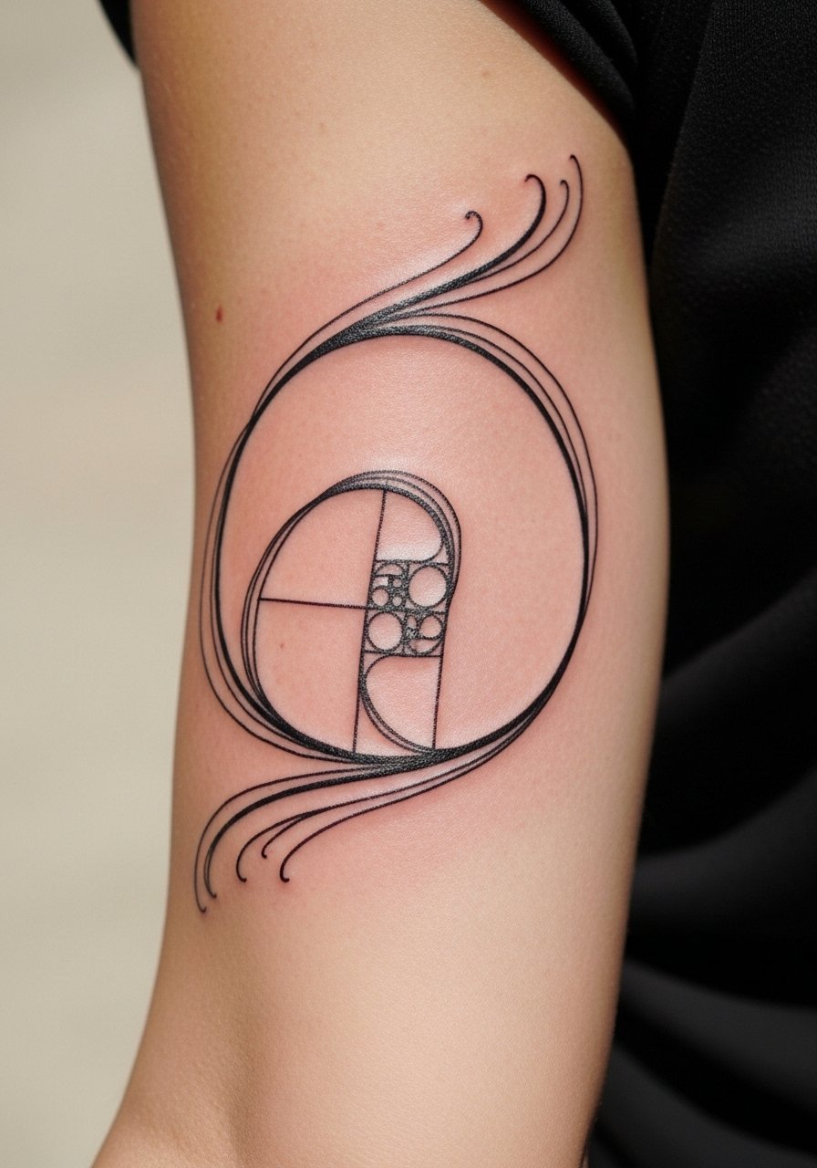Fibonacci spirals look natural on curves like the bicep. The design blends nature and math and reads like motion. Keep lines a touch bolder where they might soften over time. A mistake I see is forcing an overly precise mathematical overlay without fitting it to body contours — ask your artist to map it to your muscle lines.