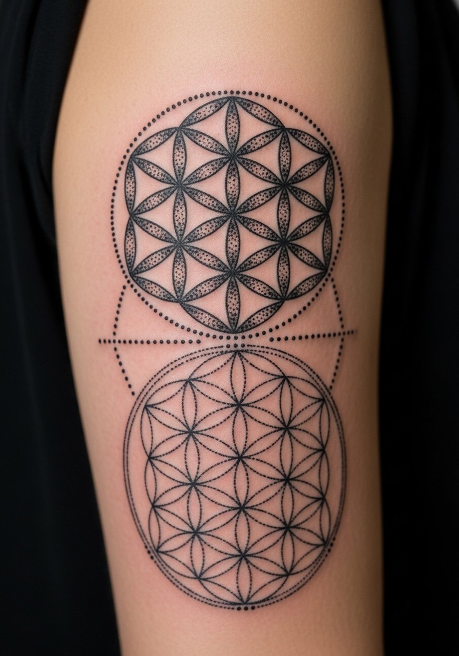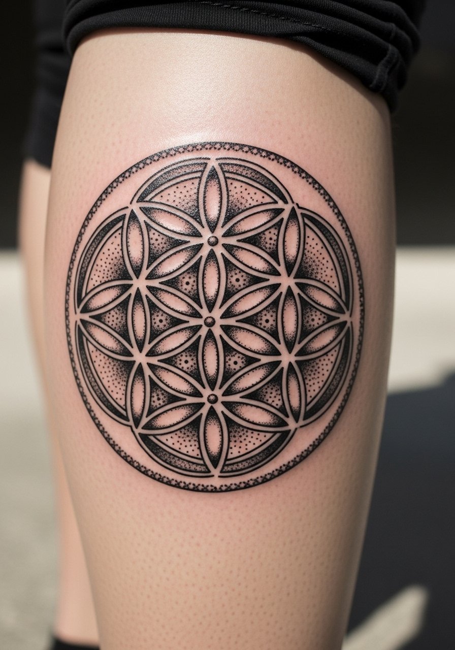 A calf panel of Seed of Life lets you build outward into larger geometric systems. Dotwork gives depth while black outlines anchor the piece. Calf placement is forgiving and ages well. Avoid overly faint dotwork — ask for contrast to survive years of movement and sun exposure.