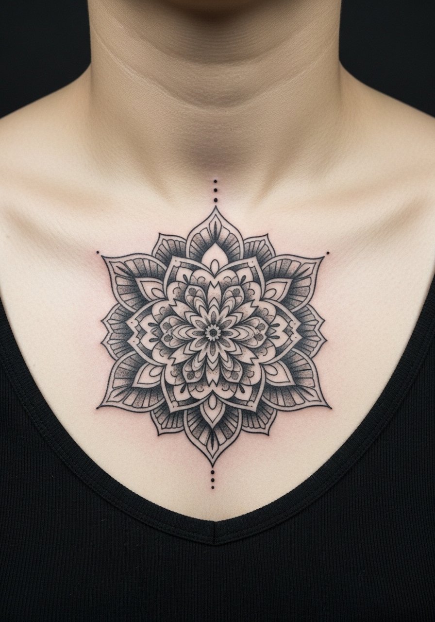 A clavicle mandala frames the chest beautifully and ties into body symmetry. This placement needs precise centering and an artist who comps to the clavicle line. Healing is straightforward if aftercare is followed; avoid clothing that rubs excessively during the first two weeks. Keep inner details balanced with negative space.