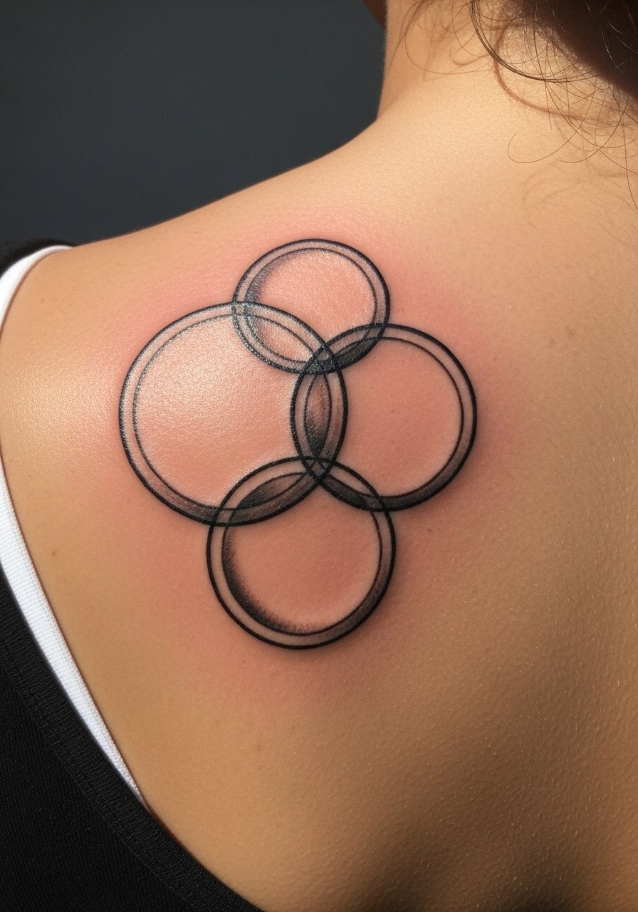 Layered circles create depth without heavy ornament. Shoulder blade placement is low-pain and easy to conceal. Use slightly varied line weights so layers remain visible as skin ages. Avoid putting too many concentric rings — clarity beats complexity here.