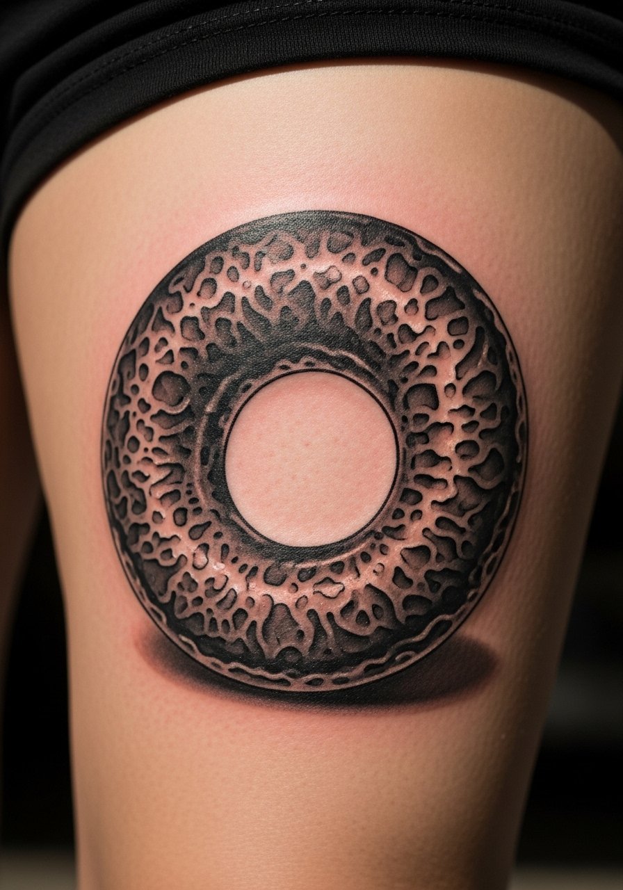 A shaded torus reads like a sculpture on skin. The thigh’s curvature supplements the 3D illusion. Artists who understand light and gradient will make it pop. Keep contrast strong and avoid soft gray-only approaches that can flatten with time.