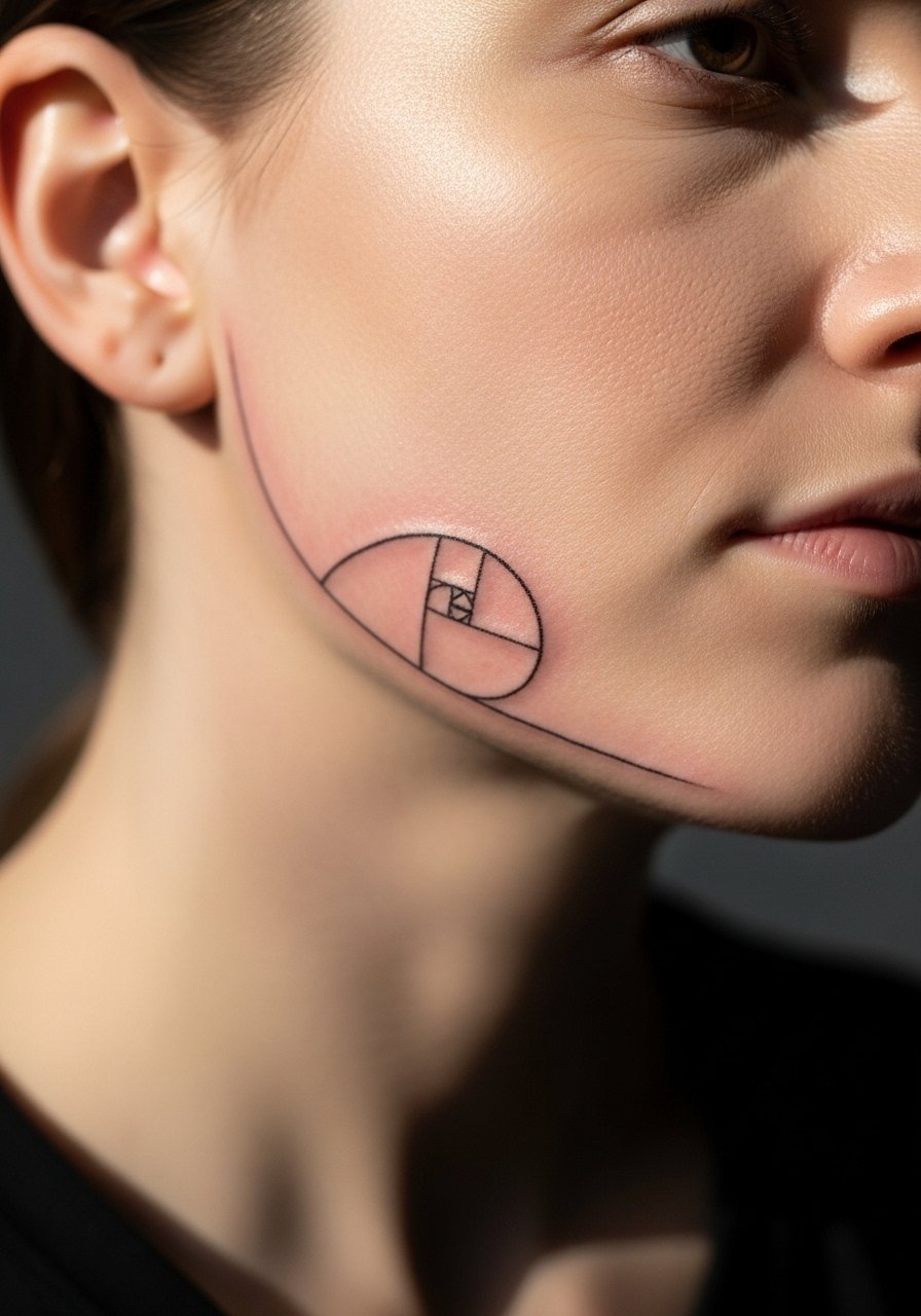 A golden-ratio curve near the jaw is unexpected and elegant. Placement must respect facial anatomy, so choose an artist who sketches directly and maps proportions. Healing is manageable but watch for irritation from shaving or clothing contact. Keep the curve simple to retain readability.