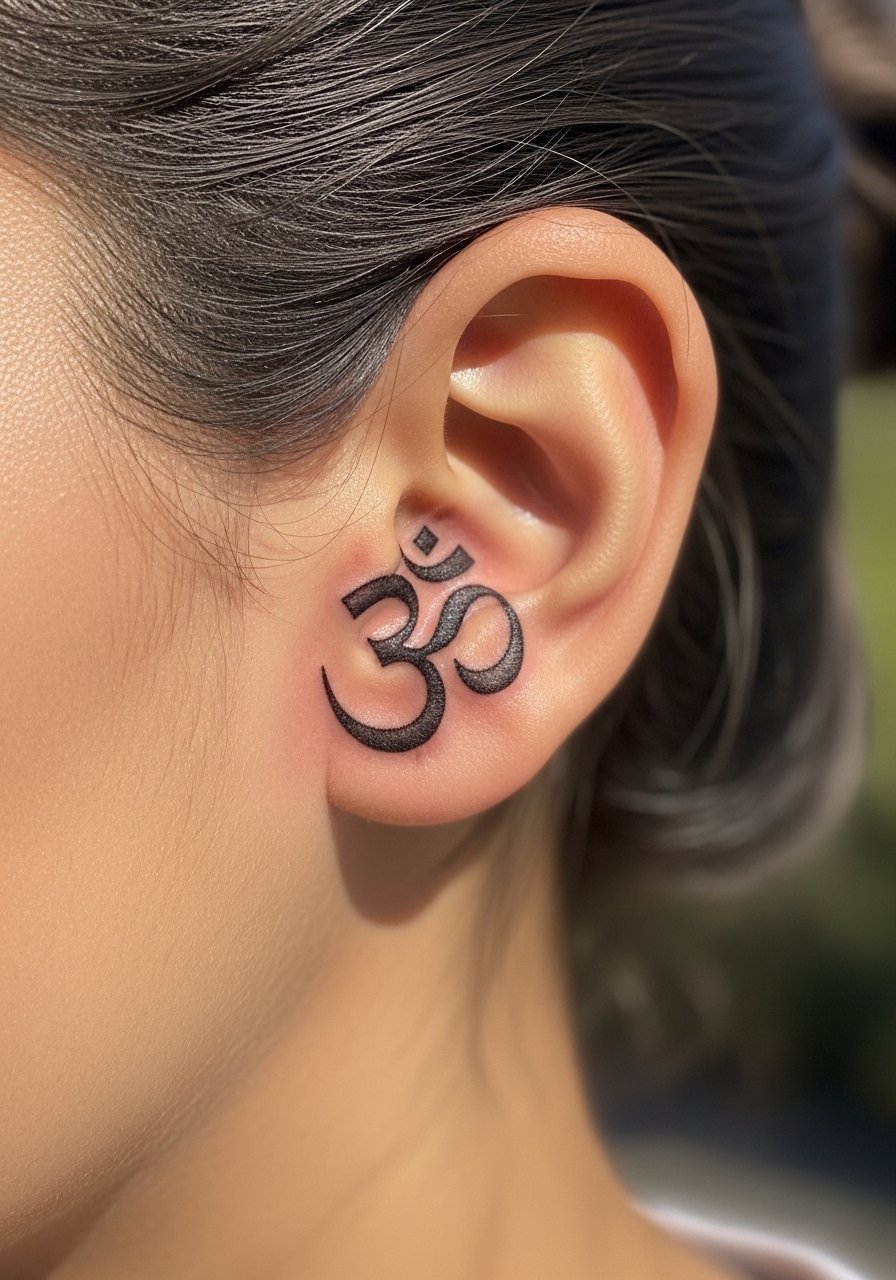 I first saw this small "ॐ" behind a friend's ear and kept staring at how intimate it felt. Behind the ear is low-pain for most people, but expect a tickly vibration during tattooing. A 10 to 20 minute session usually covers it. Ask your artist for a slightly heavier line than ultra-micro so it does not vanish after two years. From what I’ve noticed, pure ultra-thin strokes blur faster. The biggest mistake is asking for brush-thin script in that spot. Request healed reference photos of the artist doing small Devanagari script. It reads personal and discreet, and it holds energy without being showy.
