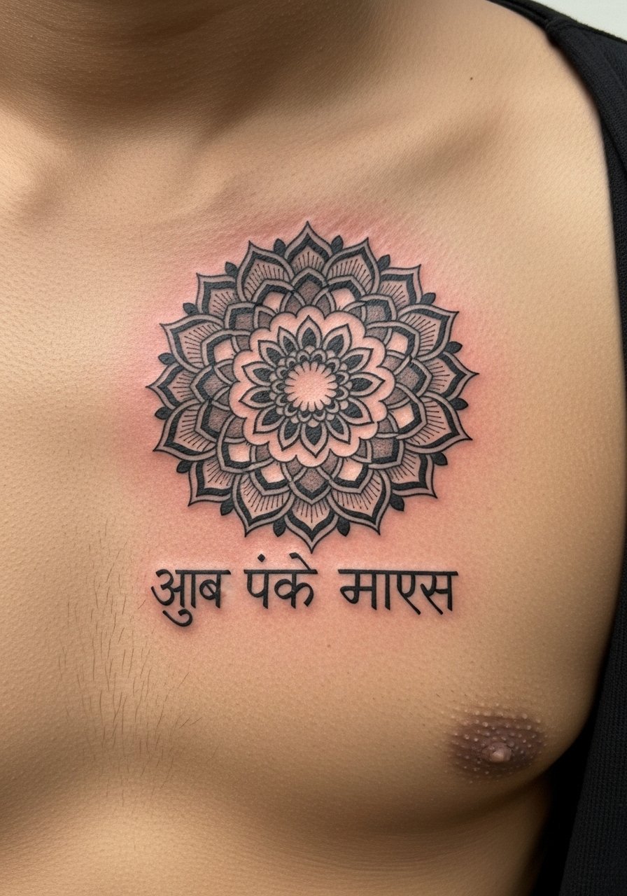Most people underestimate sternum pain. Expect a 6 to 8 out of 10 on pain. The result can be deep and sacred. I suggest bold blackwork lines around the script so the Devanagari characters stay distinct as the piece ages. Ask for screens of healed chest tattoos from the artist, not just fresh photos. Artists I’ve talked to say chest ink holds well if lines are slightly thicker and spacing is generous. A common error is insisting on ultra-fine script inside heavy dotwork. The script needs breathing room to avoid looking muddy after a year.
