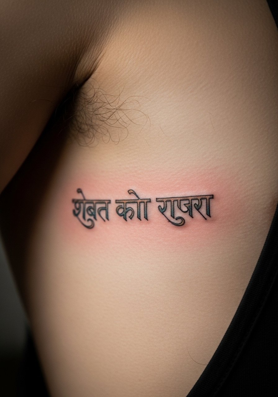 Fair warning, the ribcage hurts. I rate it a 7 out of 10. But a flowing "तत् त्वम् असि" along the curve looks dramatic. Ask for vertical spacing that follows your rib line so characters do not stretch when you breathe. From what I’ve seen, rib scripts that hug the curve with medium-weight strokes stay readable. A common mistake is requesting cramped lettering to save space. This phrase needs space to breathe. Healing takes longer because of skin movement, so expect two weeks of careful aftercare and minimal friction from clothing.
