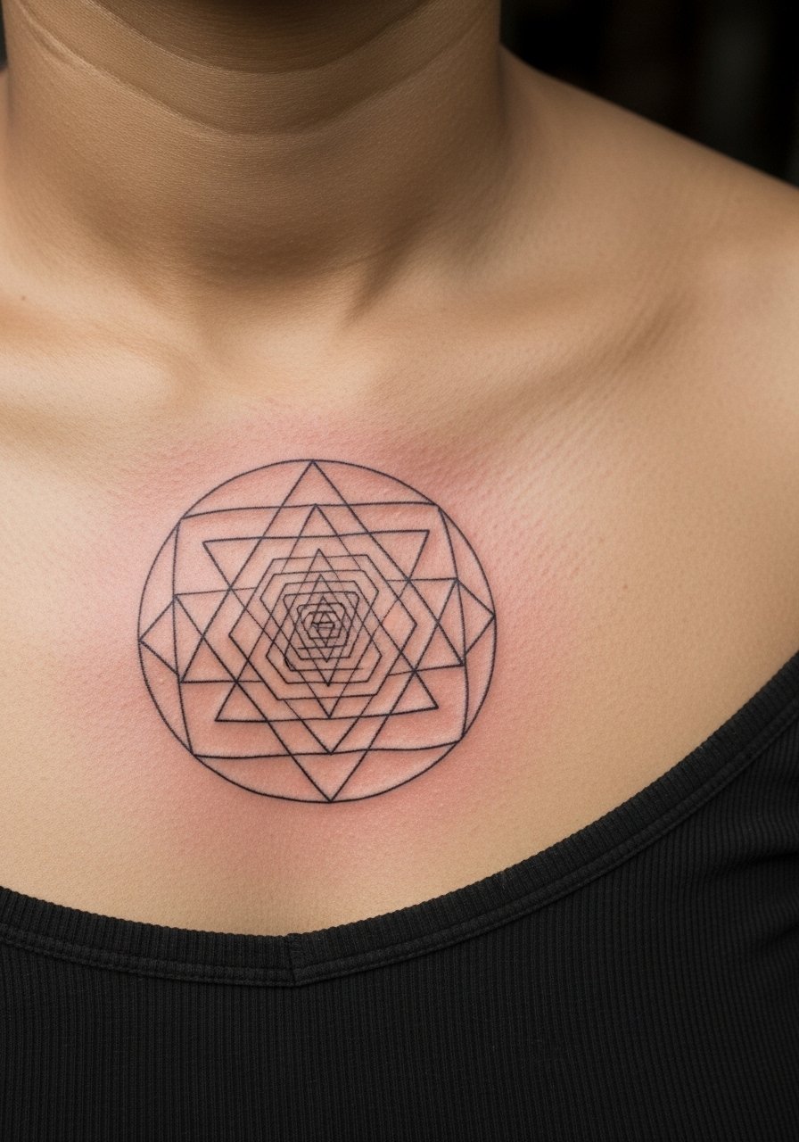 I’ve seen Sri Yantra chest pieces read as devotional centerpieces. The chest varies in pain but is generally manageable. Precision is everything here. Tell your artist you want slightly thicker anchor lines so the geometry does not lose its form with time. From what I’ve learned, perfect tiny intersections look great fresh but can melt into a muddled grid if they are too fine. A careful balance keeps the sacred geometry sharp as it heals.